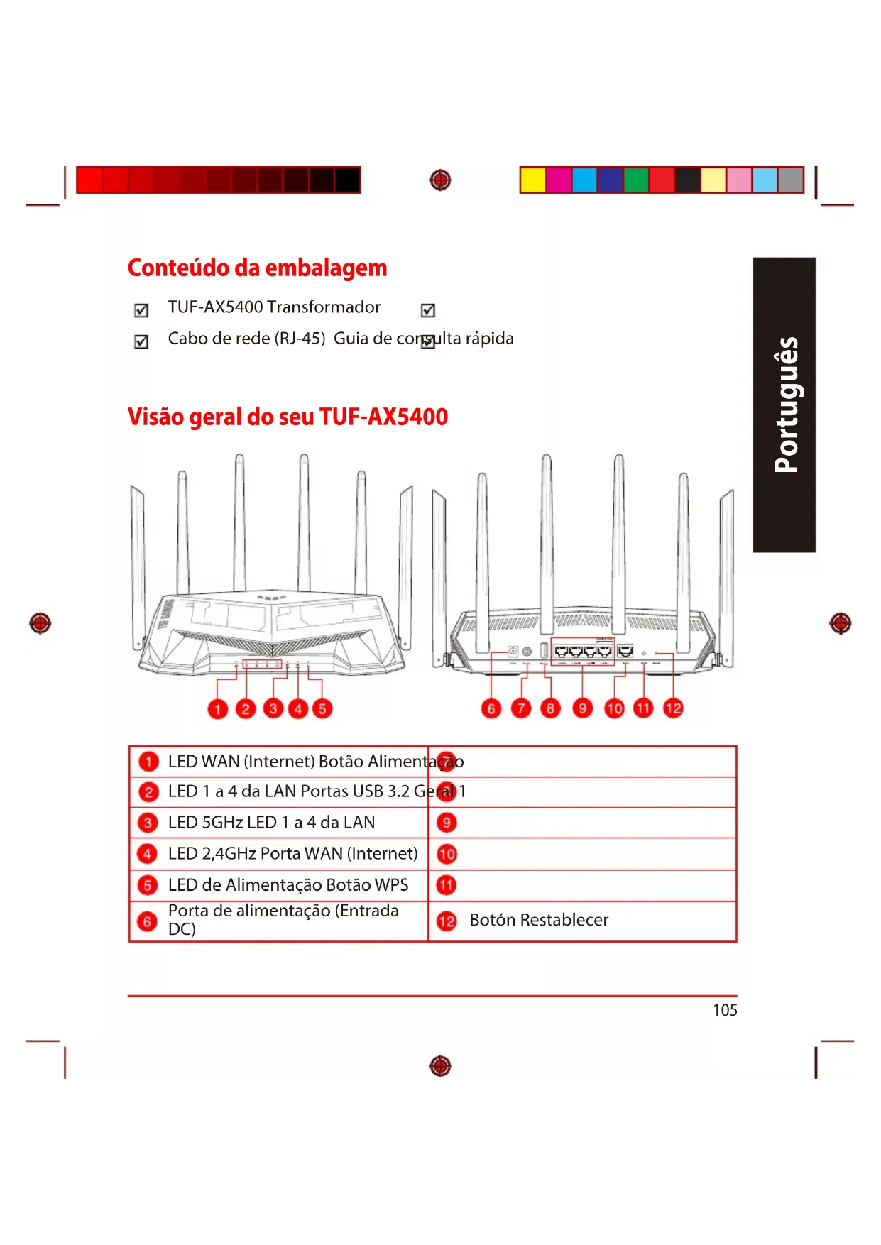 Português Visão geral do seu TUF-AX5400 Visão geral do seu TUF-AX5400 Conteúdo da embalagem Conteúdo da embalagem TUF-AX5400 Transformador Cabo de rede (RJ-45) Guia de consulta rápida LED WAN (Internet) Botão Alimentação LED 1 a 4 da LAN Portas USB 3.2 Geral 1 LED 5GHz LED 1 a 4 da LAN LED 2,4GHz Porta WAN (Internet) LED de Alimentação Botão WPS Porta de alimentação (Entrada DC) Botón Restablecer