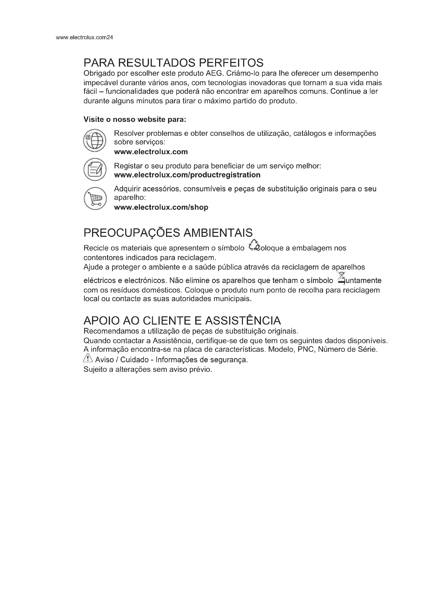 Obrigado por escolher este produto AEG Criámo-lo para lhe oferecer um desempenho impecável durante vários anos, com tecnologias inovadoras que tornam a sua vida mais fácil – funcionalidades que poderá não encontrar em aparelhos comuns Continue a ler durante alguns minutos para tirar o máximo partido do produto Visite o nosso website para: Resolver problemas e obter conselhos de utilização, catálogos e informações sobre serviços: www.electrolux.com Registar o seu produto para beneciar de um serviço melhor: www.electrolux.com/productregistration Adquirir acessórios, consumíveis e peças de substituição originais para o seu aparelho: www.electrolux.com/shop