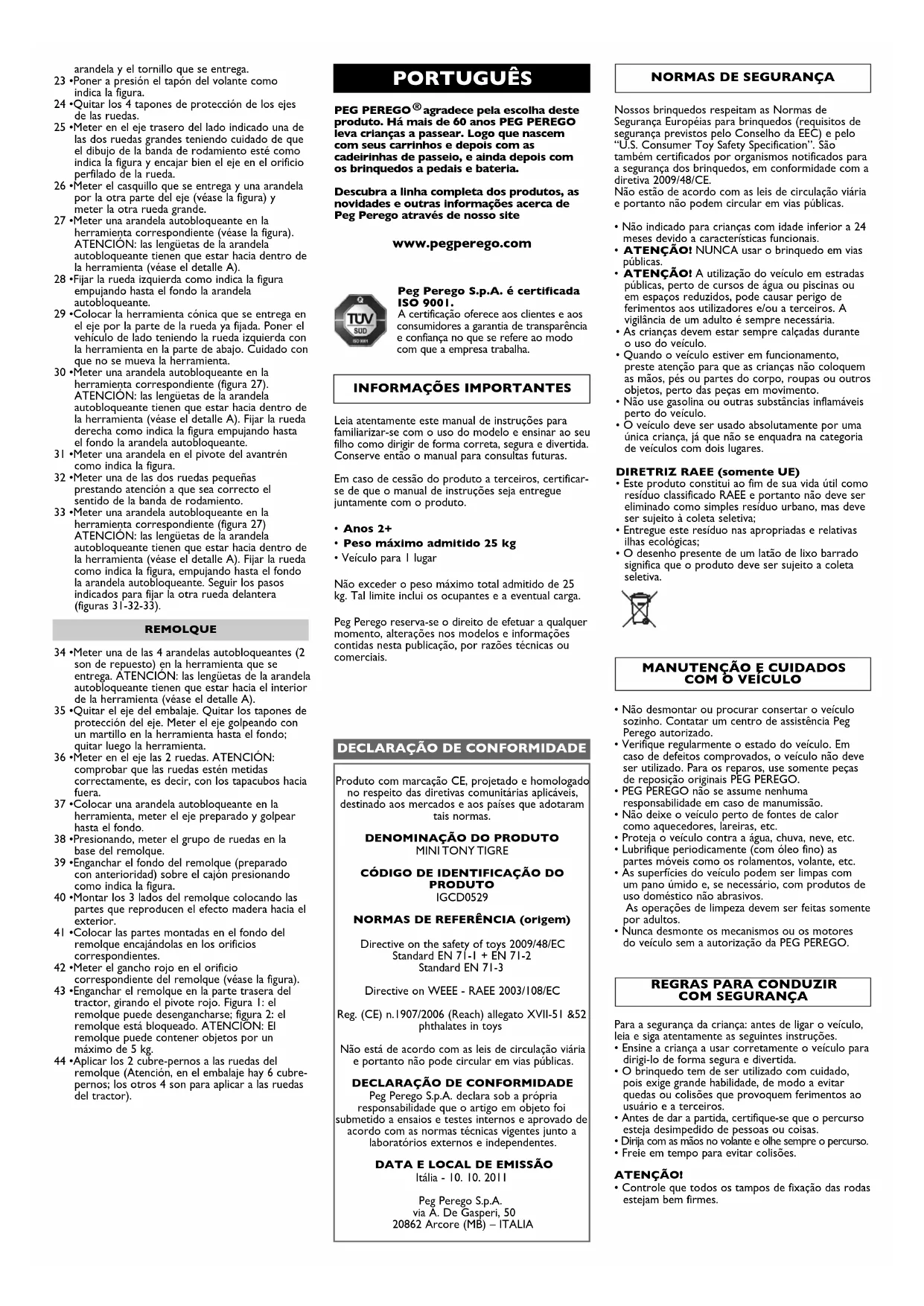 agradece pela escolha deste produto. Há mais de 60 anos PEG PEREGO leva crianças a passear. Logo que nascem com seus carrinhos e depois com as cadeirinhas de passeio, e ainda depois com os brinquedos a pedais e bateria. Descubra a linha completa dos produtos, as novidades e outras informações acerca de Peg Perego através de nosso site www.pegperego.com Peg Perego S.p.A. é certificada ISO 9001. A certificação oferece aos clientes e aos consumidores a garantia de transparência e confiança no que se refere ao modo com que a empresa trabalha. PORTUGUÊS INFORMAÇÕES IMPORTANTESIzdelek z oznako ES, načrtovan in homologiran glede na ustrezne direktive evropske skupnosti, namenjen za tržišča v državah, ki spoštujejo te predpise. NAZIV IZDELKA