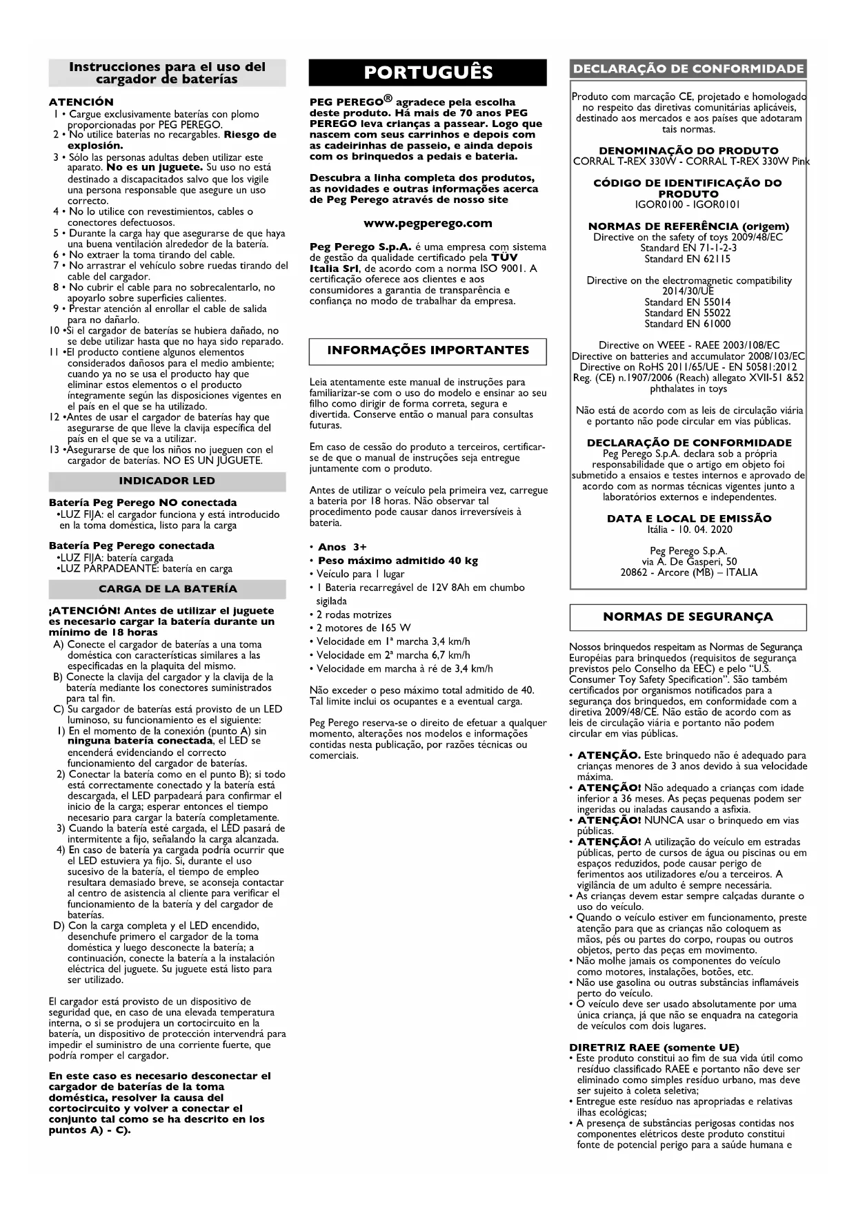 Encontre gratuitamente o manual do aparelho Corral TRex 330W PEG PEREGO em formato PDF.