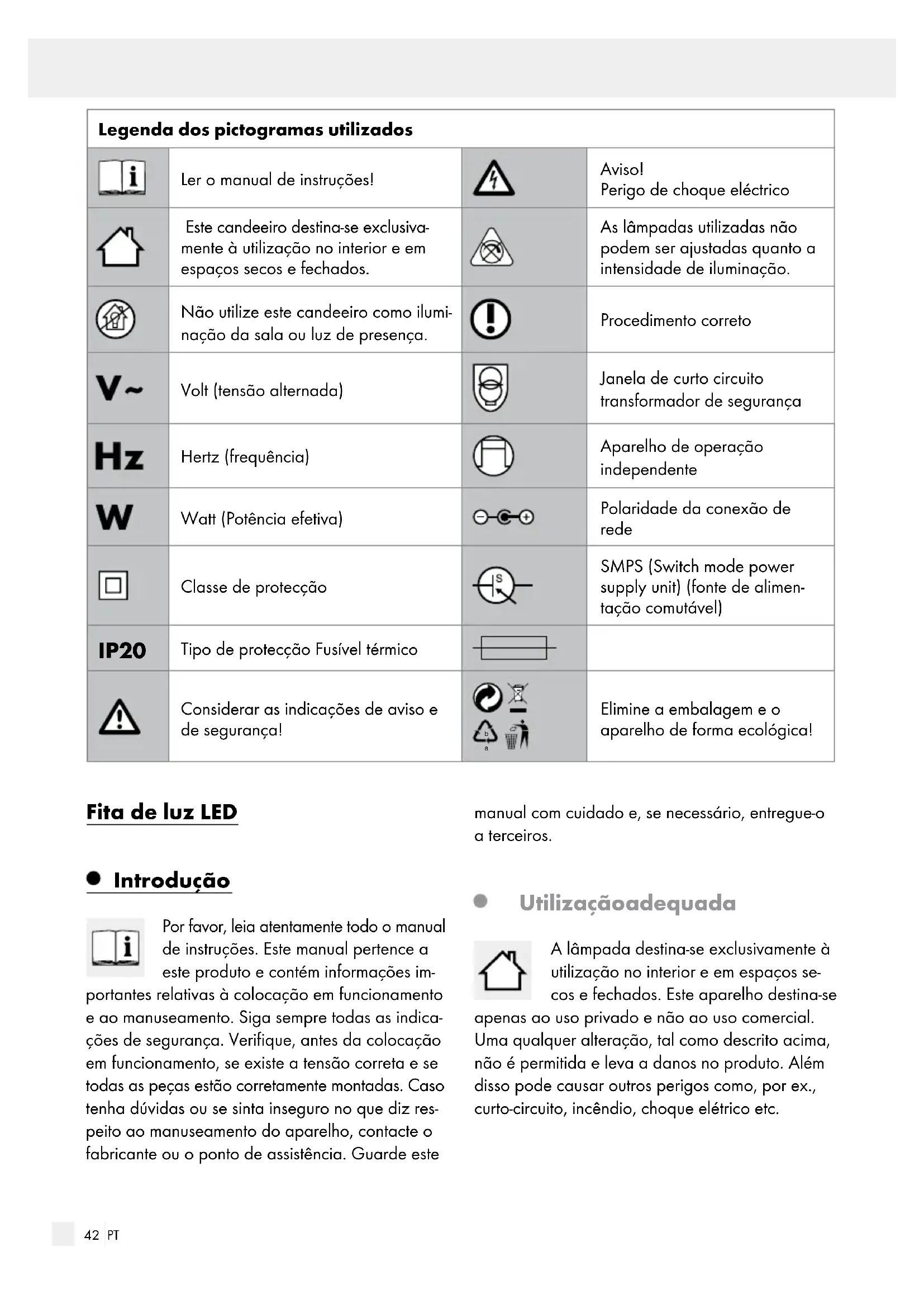 50 / 60 Hz 14109500L: máx. 7 W, 96 LED, comprimento máx. de 3 m 14109606L: máx. 9 W, 90 LED, comprimento máx. de 3 m Classe de proteção: II / Tipo de proteção: IP20 LED não substituível Segurança Indicações de segurança Em caso de danos causados pela inobservância deste manual de instruções, perde-se o direito à garantia! Não assumimos a responsabilidade por danos subsequentes! Não nos responsabilizamos por danos materiais e pessoais, causados por um manuseamento incorreto ou pela inobservância das indicações de segurança! Evite o perigo de morte por choque elétrico Verifique a fita LED quanto a eventuais danos antes de cada utilização. Se detectar quais- quer danos, não utilize a fita LED. Um cabo de conexão com a rede danificado significa perigo de morte por cho- que eléctrico. No caso de danos, reparações ou outros problemas, contacte o serviço de as- sistência técnica ou um electricista. O cabo de ligação à rede desse aparelho não pode ser substituído. Em caso de dano do cabo, o apa- relho deve ser desmantelado. O aparelho não possui quaisquer peças que possam receber manutenção por parte do consumidor. Antes da utilização, assegure-se de que a ten- são de rede disponível coincide com a tensão de serviço necessária do adaptador (veja „Dados técnicos“). Evite o contacto dos cabos de alimentação de rede de tensão com água ou outros líquidos. Nunca abra qualquer dos equipamentos elétri- cos, nem insira quaisquer objetos nos mesmos. Isto significaria perigo de morte por choque elétrico. Não monte o candeeiro em superfícies húmidas ou condutoras. Esta fita LED não pode ser conectada electrica- mente com outras fitas LED. Proteja o produto de arestas afiadas, cargas mecânicas e superfícies quentes. Não o fixe com grampos afiados nem com pregos.44 PT ... / Manutenção e limpeza / Eliminação / Garantia e assistência técnicaSegurança / Colocação em funcionamento Retire sempre a ficha da tomada antes da montagem, desmontagem ou limpeza. Nunca segure a ficha de rede ou a fita LED com as mãos molhadas ou húmidas. Utilize exclusivamente as peças individuais for- necidas, caso contrário a garantia extingue-se. Este artigo não pode ser conectado à rede eléctrica enquanto está na embalagem, a não ser que a embalagem tenha sido adaptada para mostruário. Tire o artigo completamente da embalagem antes de conectar-lo à rede eléctrica. Evite perigos de queimadura e de ferimento Este artigo não possui quaisquer peças que necessitem de manutenção por parte do con- sumidor. Os LED não podem ser substituídos. Caso os LEDs parem de funcionar no final do ciclo de vida, o artigo completo precisa ser tro- cado. Os LEDs instalados não apropriados para dimmer e interruptores eléctricos. No funcionamento, não olhar de curta distân- cia para dentro do LED. Não observar o LED com um instrumento ótico (por ex. lupa). Procedimento correto Não abandone a fita LED ou o material da embalagem de modo insensato. Existe o perigo de asfixia através do material da embalagem e perigo de vida devido a choques eléctricos. Monte a fita LED de forma a que este fique protegido da humidade, da sujidade e de for- tes aquecimentos. Esteja sempre atento! Preste sempre atenção àquilo que está a fazer e proceda de forma sensata. Seja consciencioso e nunca utilize a fita LED quando não está concentrado ou quando se sentir indisposto. Antes da utilização familiarize-se com todas as instruções e figuras deste manual, assim como com a fita LED. Para separar a fita LED completamente da alimentação de corrente, terá de se puxar o adaptador de rede da tomada. Colocação em funcionamento Remova todos os materiais de embalamento antes da primeira utilização. O conjunto de candeeiros não pode ser conectado à rede de alimentação enquanto ainda estiver na embalagem. Encurtar / ligar a fita LED Tem a possibilidade de encurtar e de ligar indivi- dualmente a fita LED.