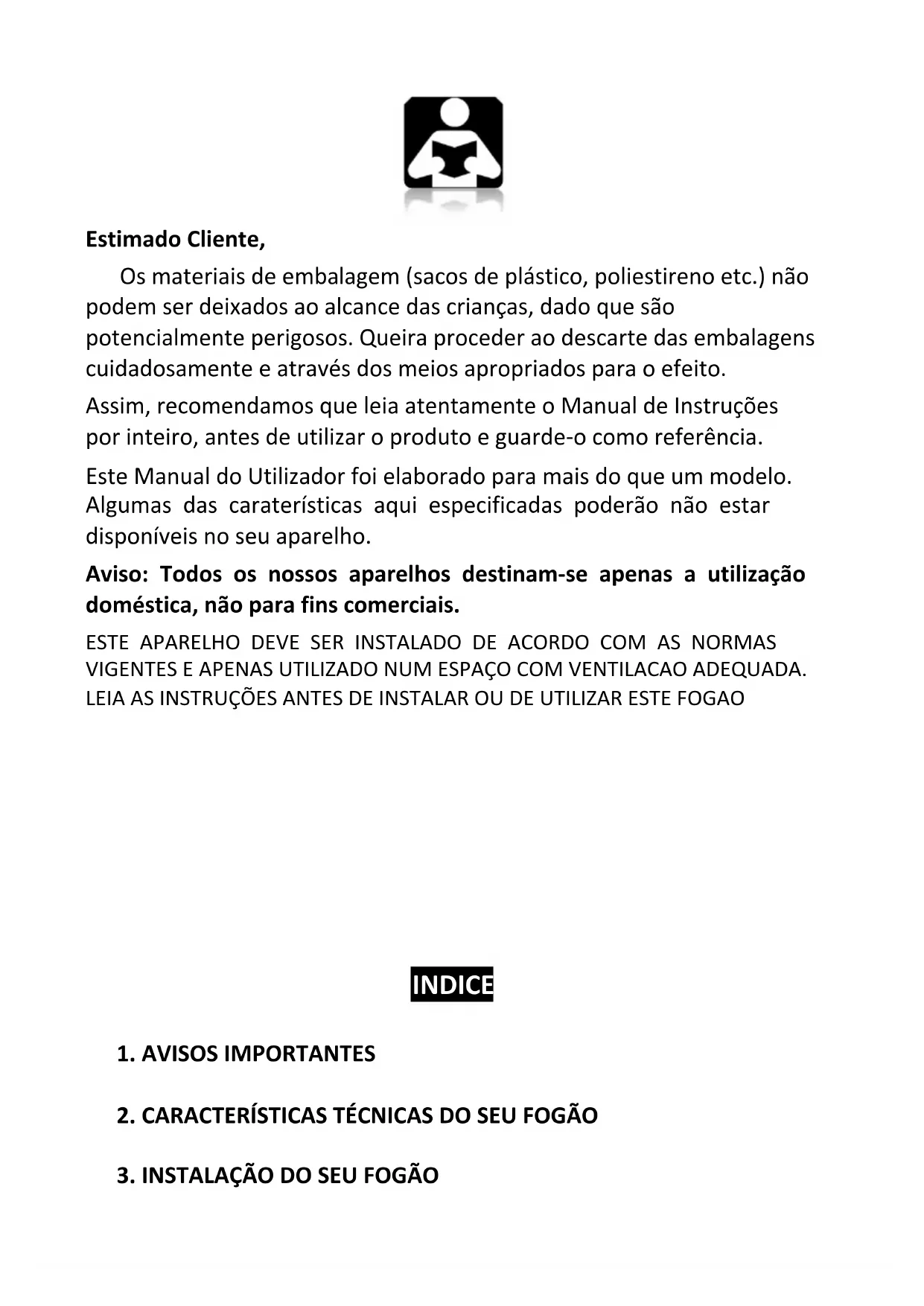 CC5051HEB CC5153HIXE CC6061EHBL CC6263IXHE CC6660BLHE CC6867EHIX CC9093BLHEP CC9291PHEBL CC50W3BL CC52W3IXEstimado Cliente, Os materiais de embalagem (sacos de plástico, poliestireno etc.) não podem ser deixados ao alcance das crianças, dado que são potencialmente perigosos. Queira proceder ao descarte das embalagens cuidadosamente e através dos meios apropriados para o efeito. Assim, recomendamos que leia atentamente o Manual de Instruções por inteiro, antes de utilizar o produto e guarde-o como referência. Este Manual do Utilizador foi elaborado para mais do que um modelo. Algumas das caraterísticas aqui especificadas poderão não estar disponíveis no seu aparelho. Aviso: Todos os nossos aparelhos destinam-se apenas a utilização doméstica, não para fins comerciais. ESTE APARELHO DEVE SER INSTALADO DE ACORDO COM AS NORMAS VIGENTES E APENAS UTILIZADO NUM ESPAÇO COM VENTILACAO ADEQUADA. LEIA AS INSTRUÇÕES ANTES DE INSTALAR OU DE UTILIZAR ESTE FOGAO INDICE