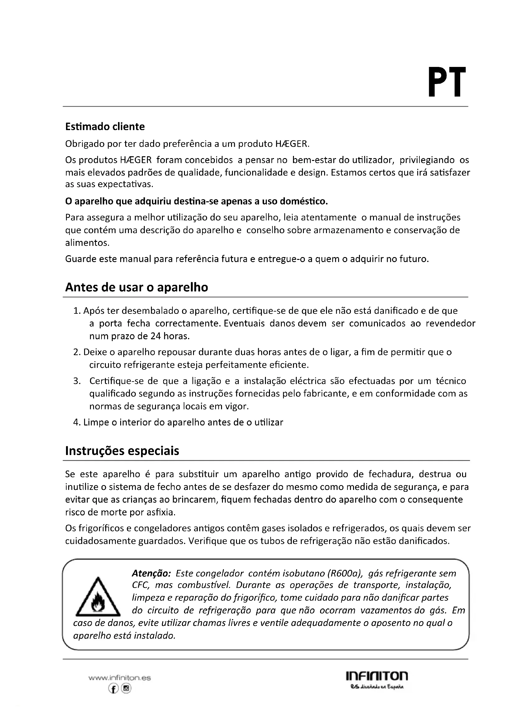 Estimado cliente Obrigado por ter dado preferência a um produto HÆGER. Os produtos HÆGER foram concebidos a pensar no bem-estar do utilizador, privilegiando os mais elevados padrões de qualidade, funcionalidade e design. Estamos certos que irá satisfazer as suas expectativas. O aparelho que adquiriu destina-se apenas a uso doméstico. Para assegura a melhor utilização do seu aparelho, leia atentamente o manual de instruções que contém uma descrição do aparelho e conselho sobre armazenamento e conservação de alimentos. Guarde este manual para referência futura e entregue-o a quem o adquirir no futuro. Antes de usar o aparelho