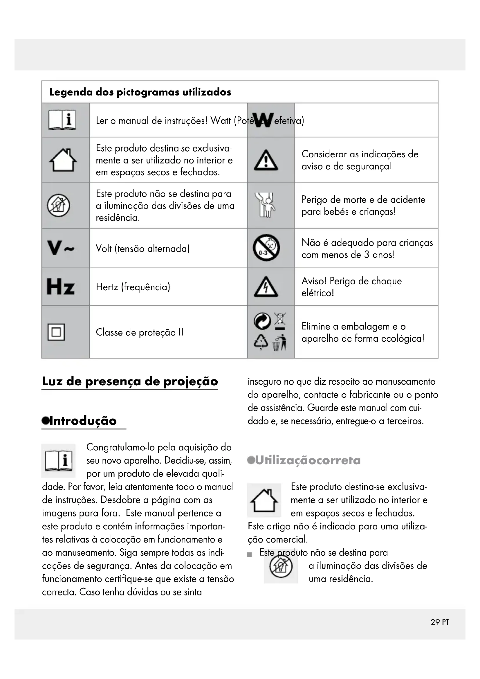 Elimine a embalagem e o aparelho de forma ecológica! Luz de presença de projeção Introdução Congratulamo-lo pela aquisição do