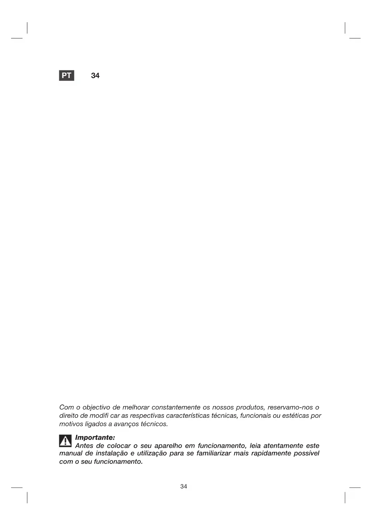 g. 1 33PT 50 Com o objectivo de melhorar constantemente os nossos produtos, reservamo-nos o direito de modifi car as respectivas características técnicas, funcionais ou estéticas por motivos ligados a avanços técnicos. Importante: Antes de colocar o seu aparelho em funcionamento, leia atentamente este manual de instalação e utilização para se familiarizar mais rapidamente possível com o seu funcionamento.
