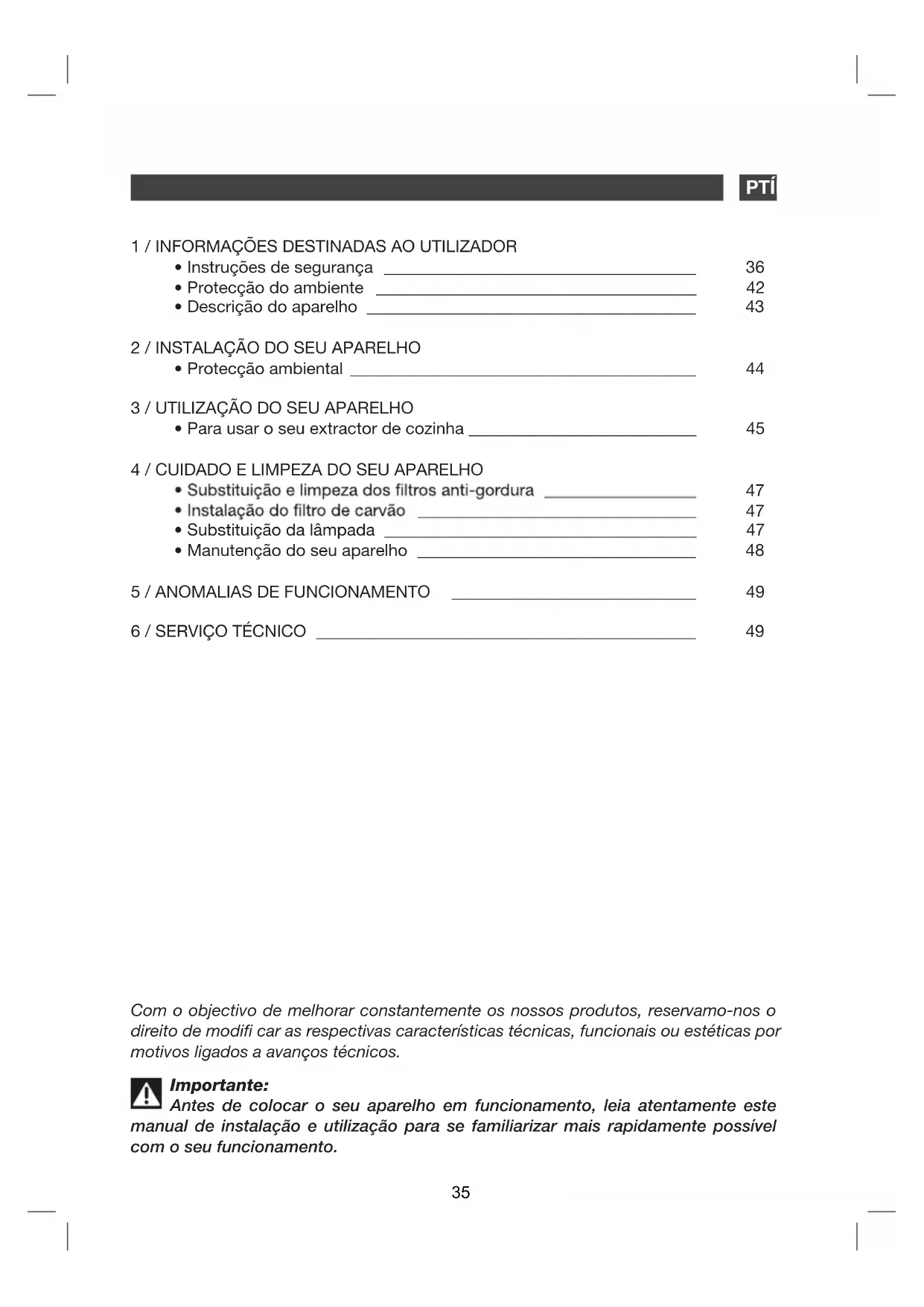 Com o objectivo de melhorar constantemente os nossos produtos, reservamo-nos o direito de modifi car as respectivas características técnicas, funcionais ou estéticas por motivos ligados a avanços técnicos. Importante: Antes de colocar o seu aparelho em funcionamento, leia atentamente este manual de instalação e utilização para se familiarizar mais rapidamente possível com o seu funcionamento.