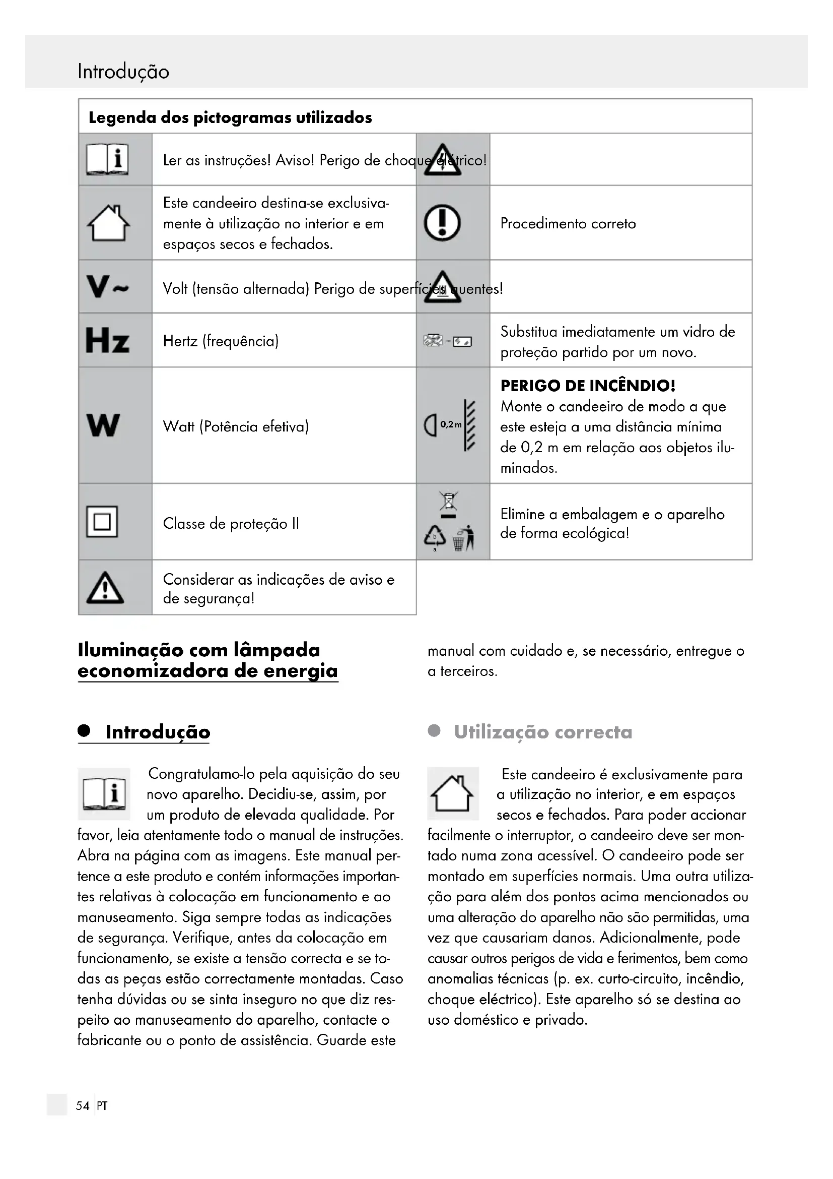 Utilização correcta Este candeeiro é exclusivamente para a utilização no interior, e em espaços secos e fechados. Para poder accionar facilmente o interruptor, o candeeiro deve ser mon- tado numa zona acessível. O candeeiro pode ser montado em superfícies normais. Uma outra utiliza- ção para além dos pontos acima mencionados ou uma alteração do aparelho não são permitidas, uma vez que causariam danos. Adicionalmente, pode causar outros perigos de vida e ferimentos, bem como anomalias técnicas (p. ex. curto-circuito, incêndio, choque eléctrico). Este aparelho só se destina ao uso doméstico e privado.55 PT