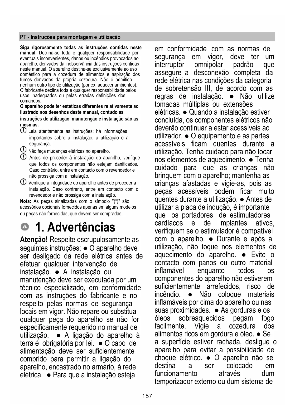 Atenção! Respeite escrupulosamente as seguintes instruções: ● O aparelho deve ser desligado da rede elétrica antes de efetuar qualquer intervenção de instalação. ● A instalação ou manutenção deve ser executada por um técnico especializado, em conformidade com as instruções do fabricante e no respeito pelas normas de segurança locais em vigor. Não repare ou substitua qualquer peça do aparelho se não for especificamente requerido no manual de utilização. ● A ligação do aparelho à terra é obrigatória por lei. ● O cabo de alimentação deve ser suficientemente comprido para permitir a ligação do aparelho, encastrado no armário, à rede elétrica. ● Para que a instalação esteja em conformidade com as normas de segurança em vigor, deve ter um interruptor omnipolar padrão que assegure a desconexão completa da rede elétrica nas condições da categoria de sobretensão III, de acordo com as regras de instalação. ● Não utilize tomadas múltiplas ou extensões elétricas. ● Quando a instalação estiver concluída, os componentes elétricos não deverão continuar a estar acessíveis ao utilizador. ● O equipamento e as partes acessíveis ficam quentes durante a utilização. Tenha cuidado para não tocar nos elementos de aquecimento. ● Tenha cuidado para que as crianças não brinquem com o aparelho; mantenha as crianças afastadas e vigie-as, pois as peças acessíveis podem ficar muito quentes durante a utilização. ● Antes de utilizar a placa de indução, é importante que os portadores de estimuladores cardíacos e de implantes ativos, verifiquem se o estimulador é compatível com o aparelho. ● Durante e após a utilização, não toque nos elementos de aquecimento do aparelho. ● Evite o contacto com panos ou outro material inflamável enquanto todos os componentes do aparelho não estiverem suficientemente arrefecidos, risco de incêndio. ● Não coloque materiais inflamáveis por cima do aparelho ou nas suas proximidades. ● As gorduras e os óleos sobreaquecidos pegam fogo facilmente. Vigie a cozedura dos alimentos ricos em gordura e óleo. ● Se a superfície estiver rachada, desligue o aparelho para evitar a possibilidade de choque elétrico. ● O aparelho não se destina a ser colocado em funcionamento através dum temporizador externo ou dum sistema de158 comando à distância separado. ● A cozedura com óleo ou gordura não vigiada sobre uma placa pode ser perigoso e causar incêndios. ● O processo de cozedura deve ser vigiado. Um processo de cozedura de tempo breve deve ser vigiado continuamente. ● NUNCA tente apagar as chamas com água. Pelo contrário, desligue o aparelho e abafe as chamas, por exemplo, com uma tampa ou uma manta ignífuga. Perigo de incêndio: não apoie objetos sobre as superfícies de cozedura. ● Não utilize máquinas de limpeza a vapor, risco de choque elétrico. ● Não coloque objetos de metal, como facas, garfos, colheres e tampas, na superfície da placa, pois podem sobreaquecer. ● Antes de ligar o aparelho à rede elétrica: verifique a placa de dados (colocada na parte inferior do aparelho) para garantir que a tensão e a potência correspondam à da rede elétrica e a tomada de ligação seja adequada. Em caso de dúvida, consulte um eletricista qualificado. Importante: ● Após o uso, desligue a placa através do seu dispositivo de comando e não confie no detetor de panela. ● Evite derramamentos de líquidos, por isso, para ferver ou aquecer líquidos, reduza o fornecimento de calor. ● Não deixe os elementos de aquecimento ligados com panelas e frigideiras vazias ou sem recipientes. ● Depois de terminar de cozinhar, desligue a respetiva zona de cozedura. ● Nunca use folhas de papel de alumínio para cozinhar, e nunca coloque diretamente produtos embalados em alumínio. O alumínio fundir-se-ia e danificaria irremediavelmente o seu aparelho. ● Nunca aqueça nenhum tipo de lata que contenha alimentos sem tê-la aberto antes: pode explodir! Este aviso aplica- se a todos os outros tipos de placas de cozinha. ● A utilização de uma potência elevada tal como a função Booster não é adequada para o aquecimento de alguns líquidos, como por exemplo, o óleo para fritar. O calor excessivo pode ser perigoso. Nestes casos, recomenda-se a utilização de uma potência inferior. ● Os recipientes devem ser colocados diretamente na placa e estar centrados. Nunca insira outros objetos entre a panela e a placa. ● Em situação de temperatura elevada, o aparelho diminui automaticamente o nível de potência das zonas de cozedura. ● Antes de qualquer operação de limpeza ou de manutenção, desligue o aparelho da rede elétrica, retirando a ficha da tomada ou desligando o interruptor geral da habitação. Para todas as operações de instalação e manutenção, use luvas de trabalho. O aparelho pode ser utilizado por crianças de idade não inferior a 8 anos e por pessoas com capacidades físicas, sensoriais ou mentais reduzidas, ou com falta de experiência ou do necessário conhecimento, desde que sob vigilância ou após terem recebido instruções acerca do uso do aparelho em segurança e da compreensão dos perigos a ele inerentes. ● As crianças devem ser vigiadas para que não brinquem com o aparelho. ● A limpeza e a manutenção não devem ser efetuadas por crianças sem vigilância. O local deve dispor de ventilação suficiente quando o aparelho for utilizado em simultâneo com outros aparelhos de combustão a gás ou outros combustíveis. ● O aparelho deve ser limpo frequentemente, quer no seu interior quer no seu exterior (PELO MENOS UMA VEZ POR MÊS), contudo respeite as indicações expressas nas instruções de manutenção. O159 incumprimento das normas de limpeza do aparelho e da substituição e limpeza dos filtros implica risco de incêndio. ● É estritamente proibida a cozedura flambê. ● O uso de chama aberta é prejudicial para os fil