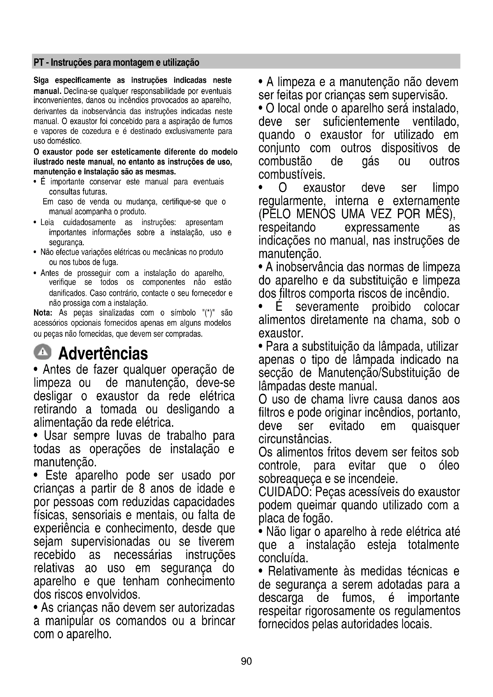 - Relativamente às medidas técnicas e de segurança a serem adotadas para a descarga de fumos, é importante respeitar rigorosamente os regulamentos fornecidos pelas autoridades locais.91