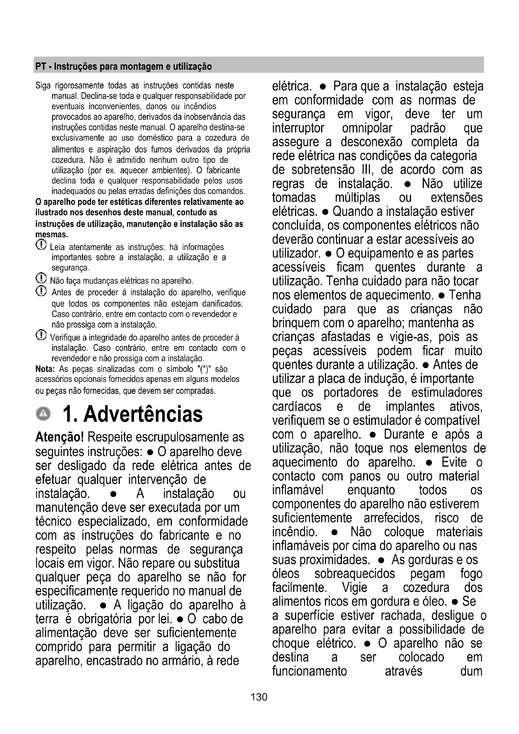 Atenção! Respeite escrupulosamente as seguintes instruções: ● O aparelho deve ser desligado da rede elétrica antes de efetuar qualquer intervenção de instalação. ● A instalação ou manutenção deve ser executada por um técnico especializado, em conformidade com as instruções do fabricante e no respeito pelas normas de segurança locais em vigor. Não repare ou substitua qualquer peça do aparelho se não for especificamente requerido no manual de utilização. ● A ligação do aparelho à terra é obrigatória por lei. ● O cabo de alimentação deve ser suficientemente comprido para permitir a ligação do aparelho, encastrado no armário, à rede elétrica. ● Para que a instalação esteja em conformidade com as normas de segurança em vigor, deve ter um interruptor omnipolar padrão que assegure a desconexão completa da rede elétrica nas condições da categoria de sobretensão III, de acordo com as regras de instalação. ● Não utilize tomadas múltiplas ou extensões elétricas. ● Quando a instalação estiver concluída, os componentes elétricos não deverão continuar a estar acessíveis ao utilizador. ● O equipamento e as partes acessíveis ficam quentes durante a utilização. Tenha cuidado para não tocar nos elementos de aquecimento. ● Tenha cuidado para que as crianças não brinquem com o aparelho; mantenha as crianças afastadas e vigie-as, pois as peças acessíveis podem ficar muito quentes durante a utilização. ● Antes de utilizar a placa de indução, é importante que os portadores de estimuladores cardíacos e de implantes ativos, verifiquem se o estimulador é compatível com o aparelho. ● Durante e após a utilização, não toque nos elementos de aquecimento do aparelho. ● Evite o contacto com panos ou outro material inflamável enquanto todos os componentes do aparelho não estiverem suficientemente arrefecidos, risco de incêndio. ● Não coloque materiais inflamáveis por cima do aparelho ou nas suas proximidades. ● As gorduras e os óleos sobreaquecidos pegam fogo facilmente. Vigie a cozedura dos alimentos ricos em gordura e óleo. ● Se a superfície estiver rachada, desligue o aparelho para evitar a possibilidade de choque elétrico. ● O aparelho não se destina a ser colocado em funcionamento através dum131 temporizador externo ou dum sistema de comando à distância separado. ● A cozedura com óleo ou gordura não vigiada sobre uma placa pode ser perigoso e causar incêndios. ● O processo de cozedura deve ser vigiado. Um processo de cozedura de tempo breve deve ser vigiado continuamente. ● NUNCA tente apagar as chamas com água. Pelo contrário, desligue o aparelho e abafe as chamas, por exemplo, com uma tampa ou uma manta ignífuga. Perigo de incêndio: não apoie objetos sobre as superfícies de cozedura. ● Não utilize máquinas de limpeza a vapor, risco de choque elétrico. ● Não coloque objetos de metal, como facas, garfos, colheres e tampas, na superfície da placa, pois podem sobreaquecer. ● Antes de ligar o aparelho à rede elétrica: verifique a placa de dados (colocada na parte inferior do aparelho) para garantir que a tensão e a potência correspondam à da rede elétrica e a tomada de ligação seja adequada. Em caso de dúvida, consulte um eletricista qualificado. Importante: ● Após o uso, desligue a placa através do seu dispositivo de comando e não confie no detetor de panela. ● Evite derramamentos de líquidos, por isso, para ferver ou aquecer líquidos, reduza o fornecimento de calor. ● Não deixe os elementos de aquecimento ligados com panelas e frigideiras vazias ou sem recipientes. ● Depois de terminar de cozinhar, desligue a respetiva zona de cozedura. ● Nunca use folhas de papel de alumínio para cozinhar, e nunca coloque diretamente produtos embalados em alumínio. O alumínio fundir-se-ia e danificaria irremediavelmente o seu aparelho. ● Nunca aqueça nenhum tipo de lata que contenha alimentos sem tê-la aberto antes: pode explodir! Este aviso aplica- se a todos os outros tipos de placas de cozinha. ● A utilização de uma potência elevada tal como a função Booster não é adequada para o aquecimento de alguns líquidos, como por exemplo, o óleo para fritar. O calor excessivo pode ser perigoso. Nestes casos, recomenda-se a utilização de uma potência inferior. ● Os recipientes devem ser colocados diretamente na placa e estar centrados. Nunca insira outros objetos entre a panela e a placa. ● Em situação de temperatura elevada, o aparelho diminui automaticamente o nível de potência das zonas de cozedura. ● Antes de qualquer operação de limpeza ou de manutenção, desligue o aparelho da rede elétrica, retirando a ficha da tomada ou desligando o interruptor geral da habitação. Para todas as operações de instalação e manutenção, use luvas de trabalho. O aparelho pode ser utilizado por crianças de idade não inferior a 8 anos e por pessoas com capacidades físicas, sensoriais ou mentais reduzidas, ou com falta de experiência ou do necessário conhecimento, desde que sob vigilância ou após terem recebido instruções acerca do uso do aparelho em segurança e da compreensão dos perigos a ele inerentes. ● As crianças devem ser vigiadas para que não brinquem com o aparelho. ● A limpeza e a manutenção não devem ser efetuadas por crianças sem vigilância. O local deve dispor de ventilação suficiente quando o aparelho for utilizado em simultâneo com outros aparelhos de combustão a gás ou outros combustíveis. ● O aparelho deve ser limpo frequentemente, quer no seu interior quer no seu exterior (PELO MENOS UMA VEZ POR MÊS), contudo respeite as indicações expressas nas132 instruções de manutenção. O incumprimento das normas de limpeza do aparelho e da substituição e limpeza dos filtros implica risco de incêndio. ● É estritamente proibida a cozedura flambê. ● O uso de chama aberta é prejudicial para os fil