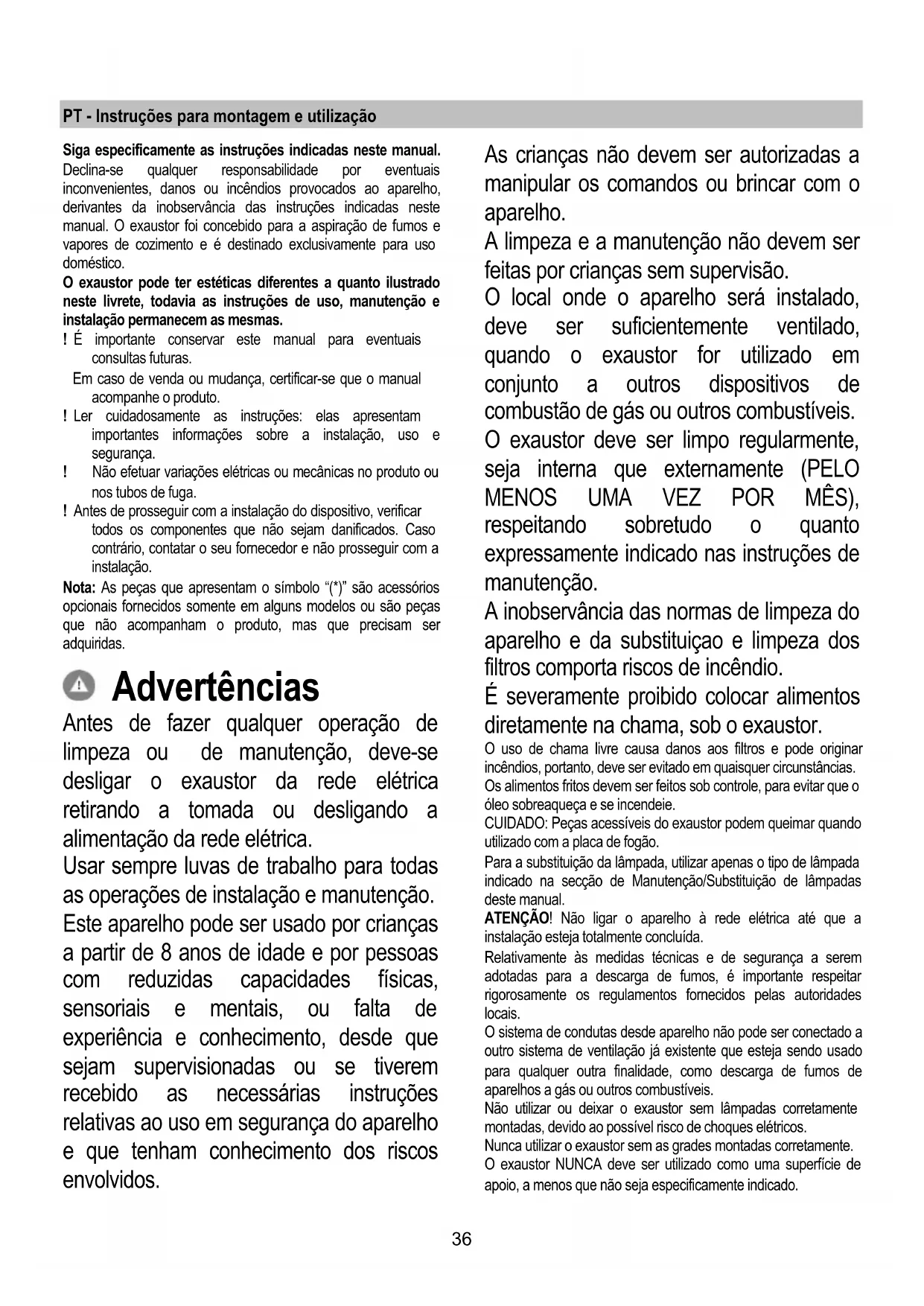 Si la iluminación no funciona, antes de llamar al servicio de asistencia técnica, revisar que las lámparas estén correctamente instaladas. - Modelo con lámparas LED La campana viene provista de un sistema de iluminación basado en la tecnología LED. Los LEDS garantizan una óptima iluminación, una duración hasta 10 veces mayor de las lámparas tradicionales y permiten aborra el 90% de energía eléctrica. . Para la sustitución dirigirse al servicio asistencia técnica .36 PT - Instruções para montagem e utilização Siga especificamente as instruções indicadas neste manual. Declina-se qualquer responsabilidade por eventuais inconvenientes, danos ou incêndios provocados ao aparelho, derivantes da inobservância das instruções indicadas neste manual. O exaustor foi concebido para a aspiração de fumos e vapores de cozimento e é destinado exclusivamente para uso doméstico. O exaustor pode ter estéticas diferentes a quanto ilustrado neste livrete, todavia as instruções de uso, manutenção e instalação permanecem as mesmas. ! É importante conservar este manual para eventuais consultas futuras. Em caso de venda ou mudança, certificar-se que o manual acompanhe o produto. ! Ler cuidadosamente as instruções: elas apresentam importantes informações sobre a instalação, uso e segurança. ! Não efetuar variações elétricas ou mecânicas no produto ou nos tubos de fuga. ! Antes de prosseguir com a instalação do dispositivo, verificar todos os componentes que não sejam danificados. Caso contrário, contatar o seu fornecedor e não prosseguir com a instalação. Nota: As peças que apresentam o símbolo “(*)” são acessórios opcionais fornecidos somente em alguns modelos ou são peças que não acompanham o produto, mas que precisam ser adquiridas. Advertências Antes de fazer qualquer operação de limpeza ou de manutenção, deve-se desligar o exaustor da rede elétrica retirando a tomada ou desligando a alimentação da rede elétrica. Usar sempre luvas de trabalho para todas as operações de instalação e manutenção. Este aparelho pode ser usado por crianças a partir de 8 anos de idade e por pessoas com reduzidas capacidades físicas, sensoriais e mentais, ou falta de experiência e conhecimento, desde que sejam supervisionadas ou se tiverem recebido as necessárias instruções relativas ao uso em segurança do aparelho e que tenham conhecimento dos riscos envolvidos. As crianças não devem ser autorizadas a manipular os comandos ou brincar com o aparelho. A limpeza e a manutenção não devem ser feitas por crianças sem supervisão. O local onde o aparelho será instalado, deve ser suficientemente ventilado, quando o exaustor for utilizado em conjunto a outros dispositivos de combustão de gás ou outros combustíveis. O exaustor deve ser limpo regularmente, seja interna que externamente (PELO MENOS UMA VEZ POR MÊS), respeitando sobretudo o quanto expressamente indicado nas instruções de manutenção. A inobservância das normas de limpeza do aparelho e da substituiçao e limpeza dos filtros comporta riscos de incêndio. É severamente proibido colocar alimentos diretamente na chama, sob o exaustor. O uso de chama livre causa danos aos filtros e pode originar incêndios, portanto, deve ser evitado em quaisquer circunstâncias. Os alimentos fritos devem ser feitos sob controle, para evitar que o óleo sobreaqueça e se incendeie. CUIDADO: Peças acessíveis do exaustor podem queimar quando utilizado com a placa de fogão. Para a substituição da lâmpada, utilizar apenas o tipo de lâmpada indicado na secção de Manutenção/Substituição de lâmpadas deste manual. ATENÇÃO! Não ligar o aparelho à rede elétrica até que a instalação esteja totalmente concluída. Relativamente às medidas técnicas e de segurança a serem adotadas para a descarga de fumos, é importante respeitar rigorosamente os regulamentos fornecidos pelas autoridades locais. O sistema de condutas desde aparelho não pode ser conectado a outro sistema de ventilação já existente que esteja sendo usado para qualquer outra finalidade, como descarga de fumos de aparelhos a gás ou outros combustíveis. Não utilizar ou deixar o exaustor sem lâmpadas corretamente montadas, devido ao possível risco de choques elétricos. Nunca utilizar o exaustor sem as grades montadas corretamente. O exaustor NUNCA deve ser utilizado como uma superfície de apoio, a menos que não seja especificamente indicado.37 Usar somente os parafusos de fixação fornecidos com o aparelho, para a instalação, ou, se não for fornecido, comprar o tipo de parafuso correto. Usar o comprimento correto para os parafusos que são identificados no Guia de Instalação. Em caso de dúvida, consultar um centro de assistência autorizado ou pessoa qualificada similar. ATENÇÃO! A falta de instalação de parafusos ou dispositivos de fixação em conformidade com estas instruções, pode resultar em riscos elétricos. Este aparelho está classificado de acordo com a Diretiva Europeia 2012/19/EC sobre Resíduos de equipamento elétrico e eletrónico (REEE). Ao garantir a eliminação adequada deste produto, estará a ajudar a evitar potenciais consequências negativas para o ambiente e para a saúde pública, que poderiam derivar de um manuseamento de dispersão inadequada deste produto. O símbolo no produto ou nos documentos que acompanham o produto, indica que este aparelho não pode receber um tratamento semelhante ao de uma dispersão doméstica. Pelo contrário, deverá ser depositado no respectivo centro de recolha para a reciclagem de equipamento elétrico e eletrónico. A eliminação deverá ser efetuada em conformidade com as normas ambientais locais para a eliminação de desperdícios. Para obter informações mais detalhadas sobre o tratamento, a recuperação e a reciclagem deste produto, contate o Departamento na sua localidade, o seu serviço de eliminação de desperdícios domésticos ou