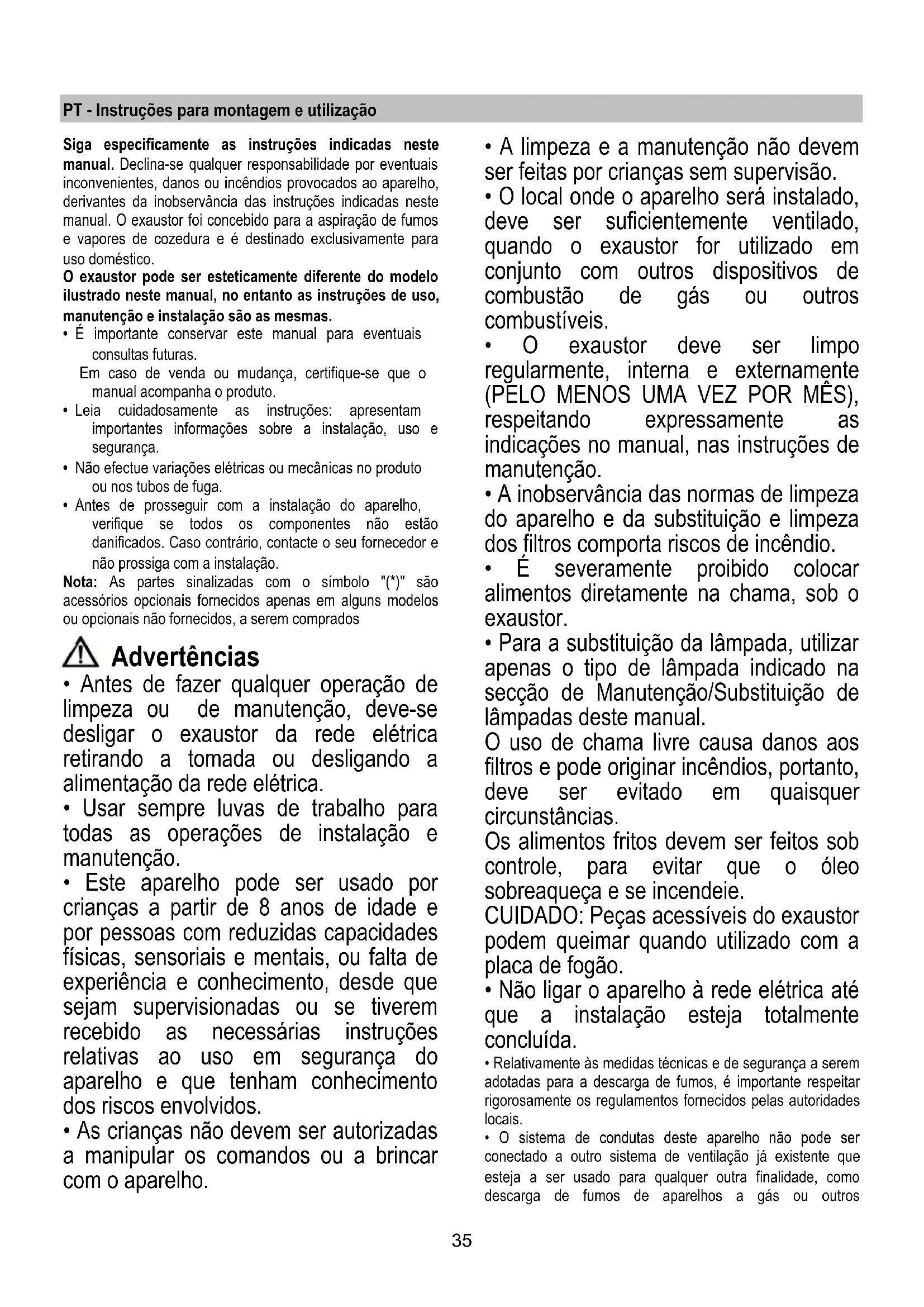 - Para a substituição da lâmpada, utilizar apenas o tipo de lâmpada indicado na secção de Manutenção/Substituição de lâmpadas deste manual. O uso de chama livre causa danos aos filtros e pode originar incêndios, portanto, deve ser evitado em quaisquer circunstâncias. Os alimentos fritos devem ser feitos sob controle, para evitar que o óleo sobreaqueça e se incendeie. CUIDADO: Peças acessíveis do exaustor podem queimar quando utilizado com a placa de fogão.