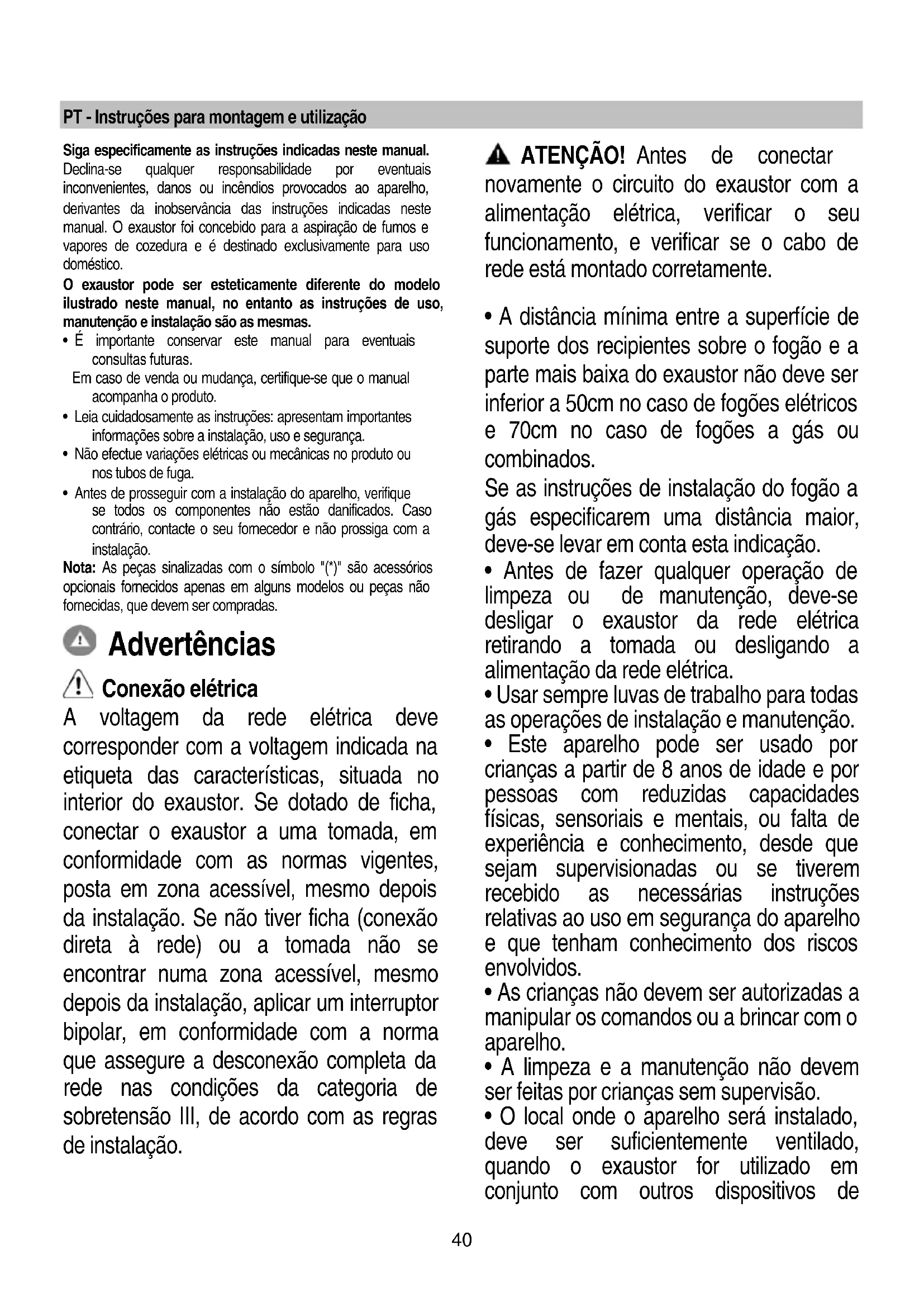 - Antes de prosseguir com a instalação do aparelho, verifique se todos os componentes não estão danificados. Caso contrário, contacte o seu fornecedor e não prossiga com a instalação. Nota: As peças sinalizadas com o símbolo "(*)" são acessórios opcionais fornecidos apenas em alguns modelos ou peças não fornecidas, que devem ser compradas. Advertências Conexão elétrica A voltagem da rede elétrica deve corresponder com a voltagem indicada na etiqueta das características, situada no interior do exaustor. Se dotado de ficha, conectar o exaustor a uma tomada, em conformidade com as normas vigentes, posta em zona acessível, mesmo depois da instalação. Se não tiver ficha (conexão direta à rede) ou a tomada não se encontrar numa zona acessível, mesmo depois da instalação, aplicar um interruptor bipolar, em conformidade com a norma que assegure a desconexão completa da rede nas condições da categoria de sobretensão III, de acordo com as regras de instalação. ATENÇÃO! Antes de conectar novamente o circuito do exaustor com a alimentação elétrica, verificar o seu funcionamento, e verificar se o cabo de rede está montado corretamente.