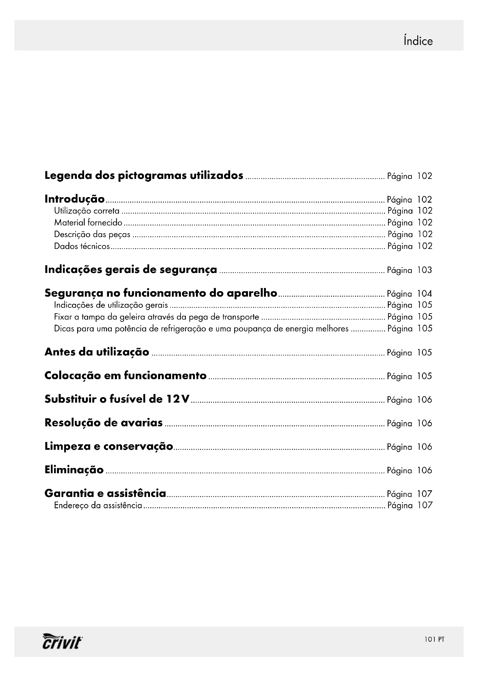 un po‘ aperto prima di riporre il frigorifero portatile elettrico, per evitare cattivi odori. Smaltimento L’imballaggio è composto da materiali ecologici che possono essere smaltiti presso i siti di raccolta locali per il riciclo. Presso l‘amministrazione competente è possibile rice- vere informazioni circa i siti di raccolta e i relativi orari di apertura. Non gettare elettrodomestici tra i rifiuti domestici! In base alla norma europea 2012 / 19 / CE relativa agli apparecchi elettrici ed elettronici usati e in ap- plicazione delle norme nazionali, gli apparecchi elettrici usati devono essere raccolti separatamente e condotti ad un loro riutilizzo non dannoso per l’ambiente. É possibile reperire informazioni circa le modalità di smaltimento dell‘apparecchio usurato presso l‘amministrazione cittadina o comunale. Garanzia e assistenza Avvertenza: questo prodotto ha una garanzia di 36 mesi a partire dalla data d‘acquisto. Il prodotto è stato realizzato con cura ed esaminato con atten- zione prima della fornitura. Se dovessero risultare difetti di produzione o di materiale durante il peri- odo di garanzia, contattare immediatamente il pro- prio rivenditore specializzato. Danni causati da una manipolazione scorretta, dall‘inosservanza delle istruzioni d’uso o causati da interventi di personale non autorizzato, sono esclusi dalla garanzia. La maggior parte delle dis- funzioni sono causate da un uso scorretto. Perciò, al presen- tarsi di disfunzioni, consultare in primo luogo le is- truzioni per l‘uso. Prima di eventuali resi della merce acquistata, si prega di contattare il nostro servizio clienti. Il reso della merce può essere accettato solo previa consul- tazione. Non si accettano spedizioni a carico del destinata- rio. L’esecuzione della prestazione di garanzia non prolunga né rinnova il periodo di garanzia di 36 me si. Indirizzo assistenza clienti Connabride Nederland BV Kooldreef 36 NL-4703 RE Roosendaal Tel: +31 165561555 E-mail: info@connabride.nl IAN 281564 Per tutte le richieste si prega di conservare lo scont- rino e il codice dell‘articolo (ad es. IAN 12345) come prova d‘acquisto. www.tuv.com ID 1000000000100101 PT Índice Legenda dos pictogramas utilizados ................................................................ Página 102 Introdução ................................................................................................................................ Página 102 Utilização correta ......................................................................................................................... Página 102 Material fornecido ........................................................................................................................ Página 102 Descrição das peças .................................................................................................................... Página 102 Dados técnicos .............................................................................................................................. Página 102 Indicações gerais de segurança ............................................................................ Página 103 Segurança no funcionamento do aparelho ................................................. Página 104 Indicações de utilização gerais ................................................................................................... Página 105 Fixar a tampa da geleira através da pega de transporte ......................................................... Página 105 Dicas para uma potência de refrigeração e uma poupança de energia melhores ................ Página 105 Antes da utilização ........................................................................................................... Página 105 Colocação em funcionamento ................................................................................. Página 105 Substituir o fusível de 12 V ......................................................................................... Página 106 Resolução de avarias ..................................................................................................... Página 106 Limpeza e conservação................................................................................................. Página 106 Eliminação ................................................................................................................................ Página 106 Garantia e assistência .................................................................................................... Página 107 Endereço da assistência ............................................................................................................... Página 107102 PT Introdução Legenda dos pictogramas utilizados Durante a utilização do aparelho no carro, outros componentes eletrónicos do carro não são influenciados na sua função. O número 24 é um número de identi- ficação do país e neste caso significa „Irlanda“. Considerar as indicações de aviso e de segurança! Os valores limites da directriz RoHS foram mantidos no fabrico do produto. Tenha cuidado com os choques elétricos! Perigo de morte! Volt Cuidado! Perigo de explosão! Corrente contínua Cuidado! Perigo de incêndio! Classe de protecção III Elimine a embalagem e o produto de forma ecológica! Geleira elétrica 22 L Introdução Parabéns pela aquisição do seu novo aparelho. Acabou de adquirir um produto de grande quali- dade. O manual de instruções é parte integrante deste aparelho. Ele contém indicações importantes refe- rentes à segurança, utilização e tratamento residual. Antes da utilização do aparelho, familiarize-se com todas as indicações de utilização e de segurança. Utilize o aparelho apenas da forma descrita e para as finalidades indicadas. Ao transmitir o aparelho a terceiros, entregue também os respetivos docu- mentos. Utilizaç