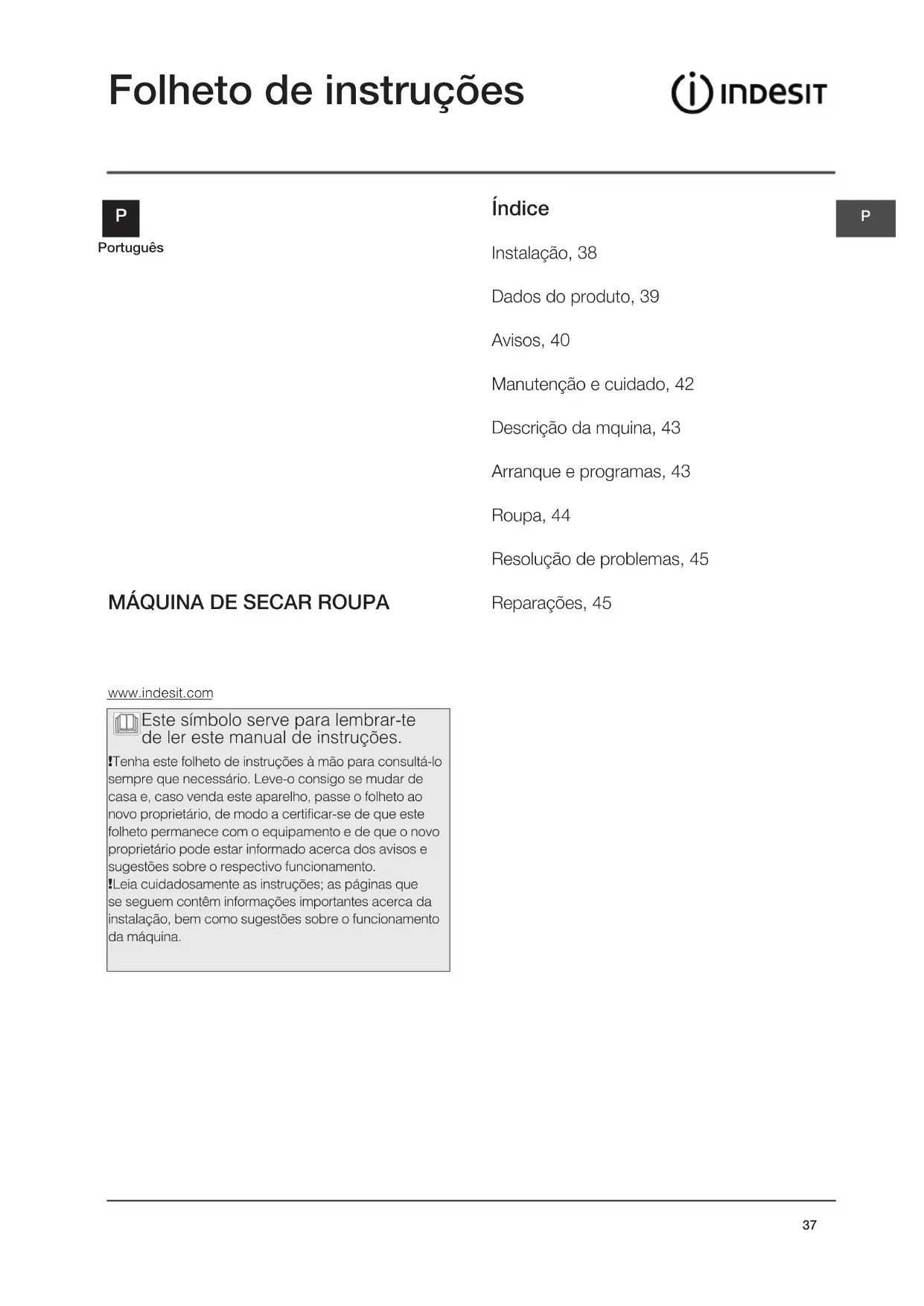 Português Folheto de instruções Índice Instalação, 38 Dados do produto, 39 Avisos, 40 Manutenção e cuidado, 42 Descrição da m●quina, 43 Arranque e programas, 43 Roupa, 44 Resolução de problemas, 45 Reparações, 45 www.indesit.com