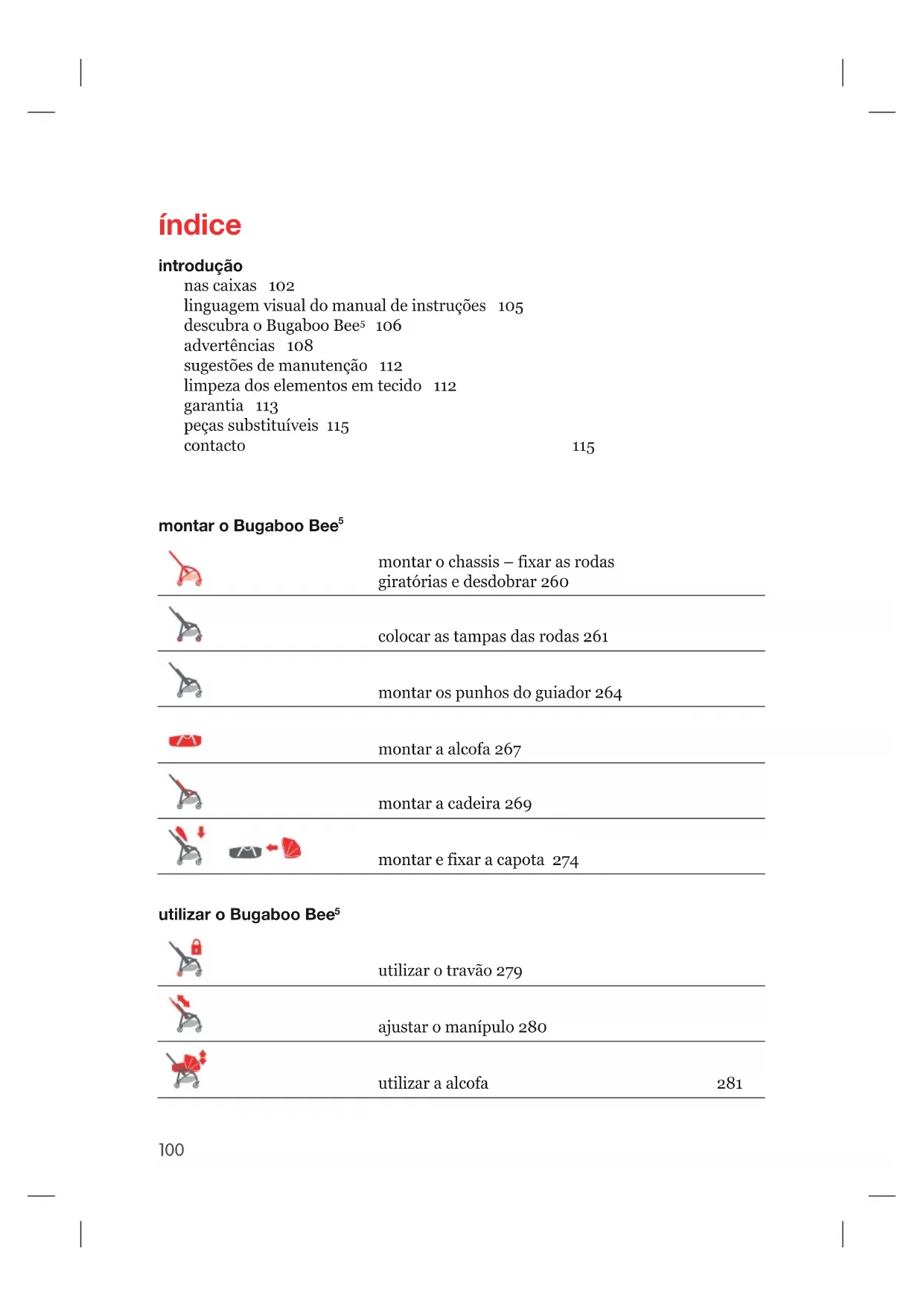 TRíndice introdução nas caixas 102 linguagem visual do manual de instruções 105 descubra o Bugaboo Bee