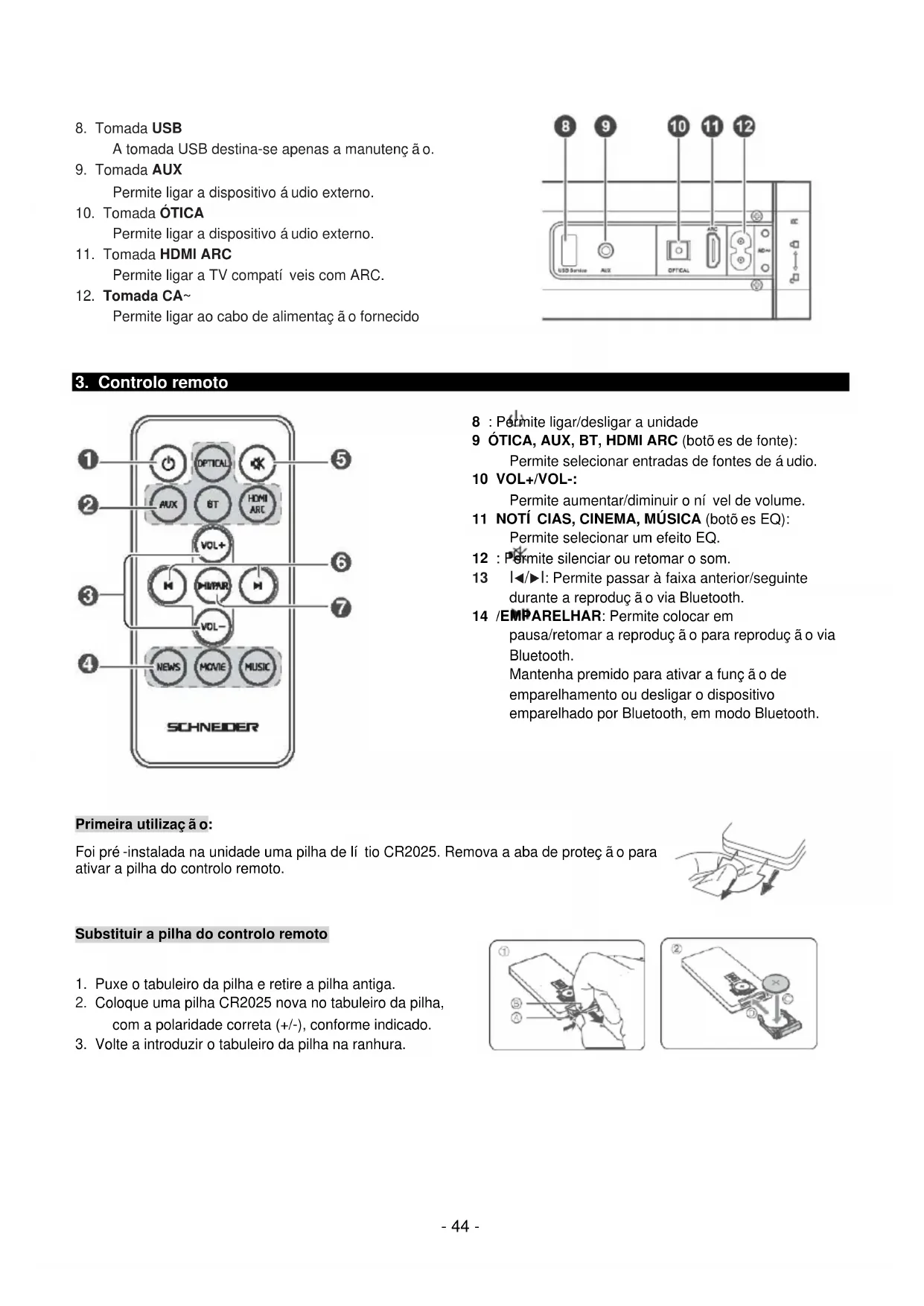 CUIDADO! Tensão perigosa no interior do produto! Não abrir. Risco de choque elétrico! Nenhuma peça pode ser reparada pelo utilizador final. Este produto apenas pode ser reparado ou obter manutenção através de pessoal qualificado para o efeito. Se o cabo elétrico estiver danificado, deve ser substituído pelo fabricante ou por técnicos qualificados do serviço pós- venda, para evitar quaisquer riscos. O produto deve ser instalado em conformidade com a legislação local. As pilhas danificadas devem ser eliminadas corretamente. Para proteger o meio ambiente, elimine as pilhas adequadamente, de acordo com as leis locais (as informações encontram-se disponíveis junto do seu revendedor). A pilha do controlo remoto (incluída) não deve ser exposta a calor excessivo (por exemplo, do sol ou de fogo). Nota: O dispositivo funciona na faixa de frequência 2454-2483,5 MHz, sendo restrito ao uso em interiores, em França Onde instalar o produto - Coloque o produto num local plano, rígido e estável. Não coloque o produto sobre um tapete. - Não coloque o produto em cima de outro, que possa causar sobreaquecimento (por exemplo, um recetor ou amplificador). - Não coloque nada por baixo do produto (por exemplo, CD ou revistas). Ventilação adequada - Coloque o produto num local suficientemente ventilado, para evitar sobreaquecimento. Deixe um espaçamento de pelo menos 10 cm na parte traseira e superior do produto e um espaçamento de 5 cm de ambos os lados, para evitar o sobreaquecimento. - Não coloque itens como, por exemplo, jornais, toalhas de mesa, cortinas, à frente das aberturas de ventilação. Não exponha o produto a temperaturas elevadas, humidade, água e pó. - O aparelho não deve ser exposto a gotejamento, nem a salpicos. Não deve ser colocado sobre o aparelho nenhum objeto cheio de líquidos como, por exemplo, vasos. - Não coloque outros itens próximos a este produto que possam danificá-lo (por exemplo, objetos que contenham água ou velas acesas). - Não devem ser colocadas chamas abertas sobre o aparelho como, por exemplo, velas acesas. Fornecimento de energia elétrica - Desligue o produto em caso de período prolongado sem utilização. - Se o cabo de alimentação estiver danificado, deve ser substituído pelo fabricante ou por técnicos qualificados do serviço pós-venda, para evitar quaisquer riscos. - Este produto deve ser ligado a uma rede elétrica de 230 V ~ 50 Hz. - A ficha de rede é utilizada como dispositivo para desligar, portanto este deve manter-se prontamente funcional - Utilize este produto apenas com o adaptador de CA fornecido. AVISO - Não ingerir a pilha, perigo de queimadura química (do controlo remoto fornecido conjuntamente); este produto contém uma pilha de célula tipo moeda/botão. Caso a pilha de célula tipo moeda/botão seja ingerida, pode provocar queimaduras internas graves em apenas 2 horas e pode provocar a morte. - Mantenha as pilhas novas e usadas fora do alcance de crianças. - Caso o compartimento da pilha não feche com segurança, pare de usar o produto e mantenha-o afastado de crianças. - Caso considere que tenham sido ingeridas pilhas ou que estas tenham sido colocadas no interior de qualquer parte do corpo, procure assistência médica de imediato.- 42 - Declaração de conformidade UE Por meio deste, a Admea declara que esta soundbar Bluetooth se encontra em conformidade com os requisitos essenciais e outras disposições da Diretiva de Equipamento de Rádio (RED) 2014/53/UE. O texto integral da declaração de conformidade UE encontra-se disponível no seguinte endereço da Internet: http://www.schneiderconsumer.com
