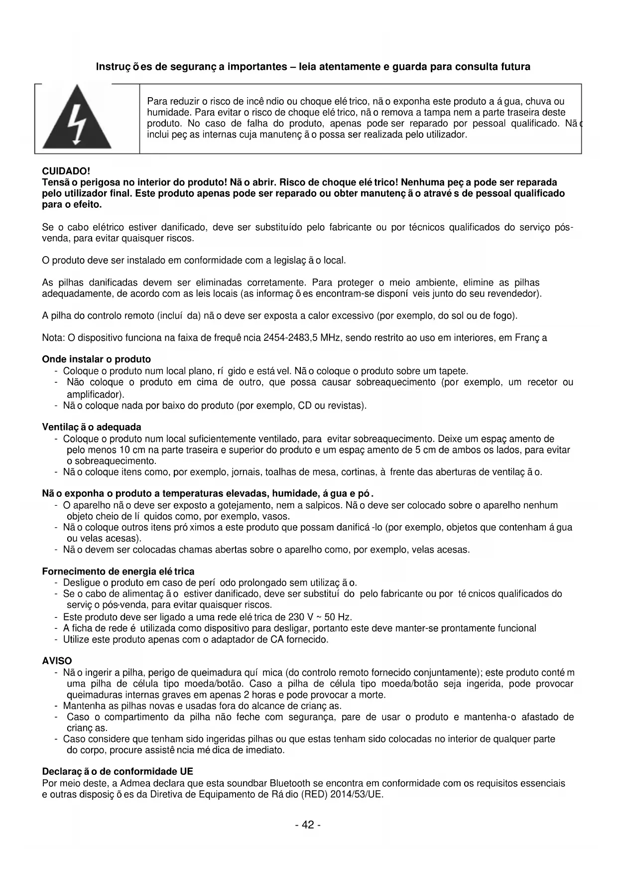 CUIDADO! Tensão perigosa no interior do produto! Não abrir. Risco de choque elétrico! Nenhuma peça pode ser reparada pelo utilizador final. Este produto apenas pode ser reparado ou obter manutenção através de pessoal qualificado para o efeito. Se o cabo elétrico estiver danificado, deve ser substituído pelo fabricante ou por técnicos qualificados do serviço pós- venda, para evitar quaisquer riscos. O produto deve ser instalado em conformidade com a legislação local. As pilhas danificadas devem ser eliminadas corretamente. Para proteger o meio ambiente, elimine as pilhas adequadamente, de acordo com as leis locais (as informações encontram-se disponíveis junto do seu revendedor). A pilha do controlo remoto (incluída) não deve ser exposta a calor excessivo (por exemplo, do sol ou de fogo). Nota: O dispositivo funciona na faixa de frequência 2454-2483,5 MHz, sendo restrito ao uso em interiores, em França Onde instalar o produto - Coloque o produto num local plano, rígido e estável. Não coloque o produto sobre um tapete. - Não coloque o produto em cima de outro, que possa causar sobreaquecimento (por exemplo, um recetor ou amplificador). - Não coloque nada por baixo do produto (por exemplo, CD ou revistas). Ventilação adequada - Coloque o produto num local suficientemente ventilado, para evitar sobreaquecimento. Deixe um espaçamento de pelo menos 10 cm na parte traseira e superior do produto e um espaçamento de 5 cm de ambos os lados, para evitar o sobreaquecimento. - Não coloque itens como, por exemplo, jornais, toalhas de mesa, cortinas, à frente das aberturas de ventilação. Não exponha o produto a temperaturas elevadas, humidade, água e pó. - O aparelho não deve ser exposto a gotejamento, nem a salpicos. Não deve ser colocado sobre o aparelho nenhum objeto cheio de líquidos como, por exemplo, vasos. - Não coloque outros itens próximos a este produto que possam danificá-lo (por exemplo, objetos que contenham água ou velas acesas). - Não devem ser colocadas chamas abertas sobre o aparelho como, por exemplo, velas acesas. Fornecimento de energia elétrica - Desligue o produto em caso de período prolongado sem utilização. - Se o cabo de alimentação estiver danificado, deve ser substituído pelo fabricante ou por técnicos qualificados do serviço pós -venda, para evitar quaisquer riscos. - Este produto deve ser ligado a uma rede elétrica de 230 V ~ 50 Hz. - A ficha de rede é utilizada como dispositivo para desligar, portanto este deve manter-se prontamente funcional - Utilize este produto apenas com o adaptador de CA fornecido. AVISO - Não ingerir a pilha, perigo de queimadura química (do controlo remoto fornecido conjuntamente); este produto contém uma pilha de célula tipo moeda/botão. Caso a pilha de célula tipo moeda/botão seja ingerida, pode provocar queimaduras internas graves em apenas 2 horas e pode provocar a morte. - Mantenha as pilhas novas e usadas fora do alcance de crianças. - Caso o compartimento da pilha não feche com segurança, pare de usar o produto e mantenha-o afastado de crianças. - Caso considere que tenham sido ingeridas pilhas ou que estas tenham sido colocadas no interior de qualquer parte do corpo, procure assistência médica de imediato. Declaração de conformidade UE Por meio deste, a Admea declara que esta soundbar Bluetooth se encontra em conformidade com os requisitos essenciais e outras disposições da Diretiva de Equipamento de Rádio (RED) 2014/53/UE.- 43 - O texto integral da declaração de conformidade UE encontra-se disponível no seguinte endereço da Internet: http://www.schneiderconsumer.com