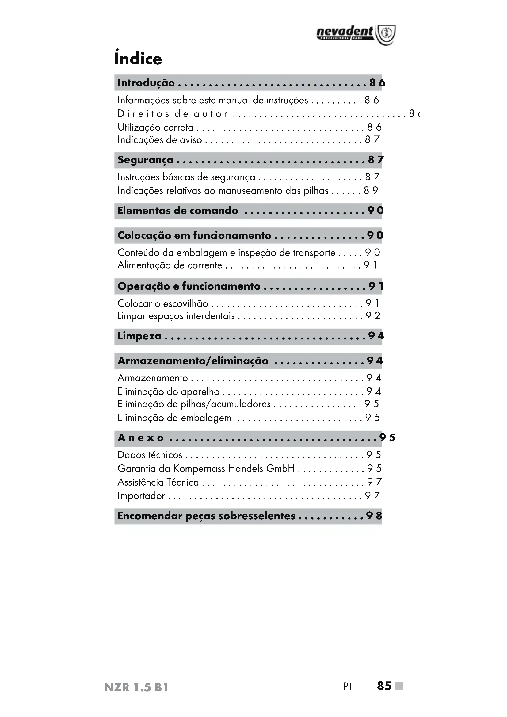 PT Introdução Informações sobre este manual de instruções Parabéns pela compra do seu novo aparelho. Optou por um produto de elevada qualidade. O manual de instruções é parte integrante deste produto. Este contém instruções importantes para a segurança, utilização e eliminação. Antes de utilizar o produto, familiarize-se com todas as instruções de operação e segurança. Utilize o produto apenas como descrito e nas áreas de aplicação indicadas. Ao transferir ou vender o produto a terceiros, entregue todos os respetivos documentos, inclusive este manual de instrução. Direitos de autor Esta documentação está protegida por direitos de autor. Não é permitido duplicar ou reimprimir, total ou parcialmente, o presente documento, bem como reproduzir imagens, mesmo que alteradas, sem a autorização por escrito do fabricante. Utilização correta Este aparelho foi concebido para a limpeza dos espaços interdentais. Qualquer utilização diferente ou fora do âmbito descrito é considerada incorreta. O aparelho não se destina à utilização em áreas comerciais ou industriais. Não é assumida qualquer responsabilidade por danos resul- tantes da utilização incorreta, de reparações indevidas, de alterações não autorizadas ou da utilização de peças sobres- selentes não permitida. O risco é assumido exclusivamente pelo proprietário.NZR 1.5 B1 PT