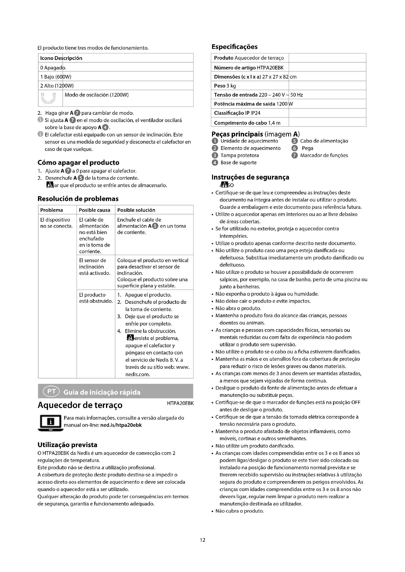 Guia de iniciação rápida Aquecedor de terraço HTPA20EBKPara mais informações, consulte a versão alargada do manual on-line: ned.is/htpa20ebk Utilização prevista O HTPA20EBK da Nedis é um aquecedor de convecção com 2 regulações de temperatura.Este produto não se destina a utilização prossional.A cobertura de proteção deste produto destina-se a impedir o acesso direto aos elementos de aquecimento e deve ser colocada quando o aquecedor está a ser utilizado.Qualquer alteração do produto pode ter consequências em termos de segurança, garantia e funcionamento adequado.13 Resolução de problemas Problema Causa possívelSolução possívelO produto não liga.O cabo de alimentação não está rmemente ligado à tomada elétricaLigue o cabo de alimentação