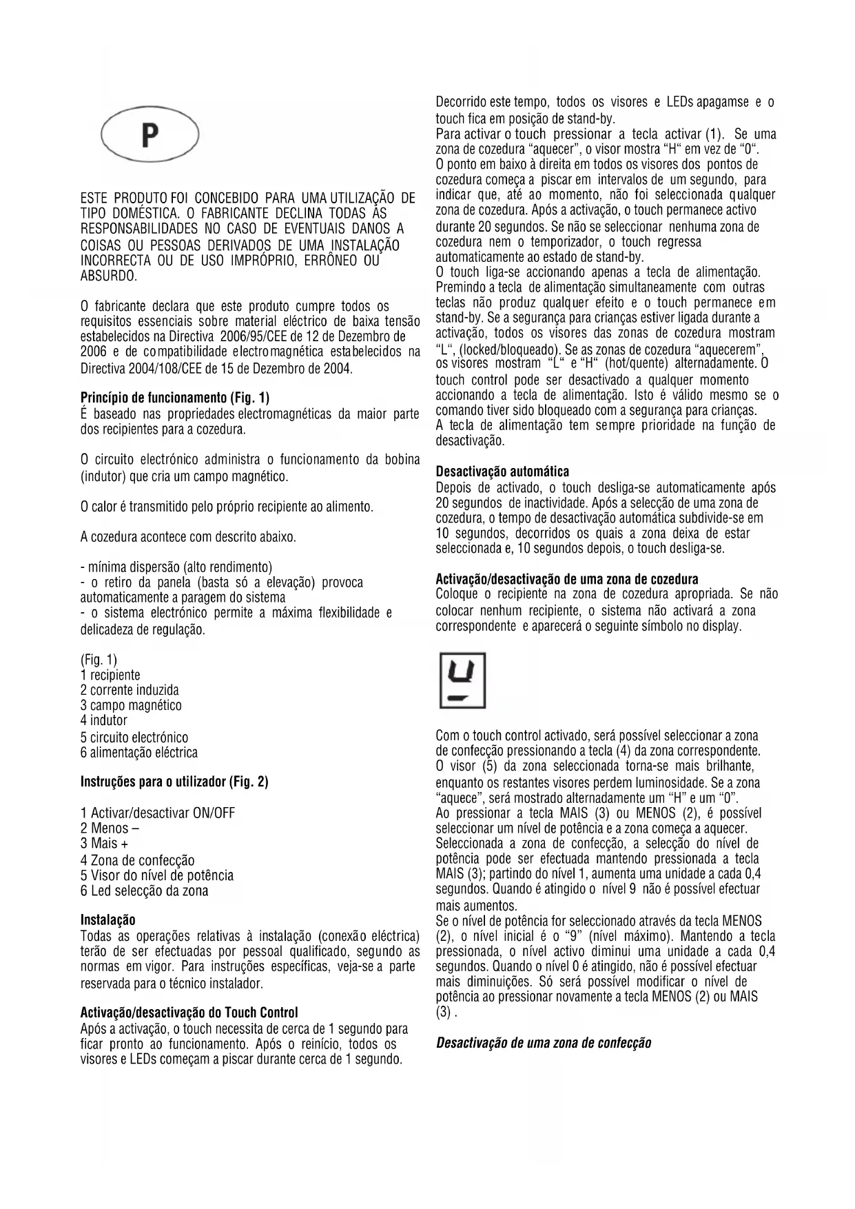 stekker of schakelaar moet gemakkelijk bereikbaar zijn als de apparatuur eenmaal geinstalleerd is. Dit apparaat kan niet met een aparte externe timer of afstandsbediening worden bediend. De fabrikant wijst iedere verantwoordelijkheid af in geval dat het bovenstaande en de gebruikelijke preventieve normen niet worden gerespecteerd. Als de voedingskabel beschadigd is, moet deze door de fabrikant of door de technische dienst worden vervangen of in elk geval door een persoon met een soortgelijke kwalificatie, zodat elk gevaar wordt vermeden.ESTE PRODUTO FOI CONCEBIDO PARA UMA UTILIZAÇÃO DE TIPO DOMÉSTICA. O FABRICANTE DECLINA TODAS AS RESPONSABILIDADES NO CASO DE EVENTUAIS DANOS A COISAS OU PESSOAS DERIVADOS DE UMA INSTALAÇÃO INCORRECTA OU DE USO IMPRÓPRIO, ERRÔNEO OU ABSURDO. O fabricante declara que este produto cumpre todos os requisitos essenciais sobre material eléctrico de baixa tensão estabelecidos na Directiva 2006/95/CEE de 12 de Dezembro de 2006 e de compatibilidade electromagnética estabelecidos na Directiva 2004/108/CEE de 15 de Dezembro de 2004. Princípio de funcionamento (Fig. 1) É baseado nas propriedades electromagnéticas da maior parte dos recipientes para a cozedura. O circuito electrónico administra o funcionamento da bobina (indutor) que cria um campo magnético. O calor é transmitido pelo próprio recipiente ao alimento. A cozedura acontece com descrito abaixo. - mínima dispersão (alto rendimento) - o retiro da panela (basta só a elevação) provoca automaticamente a paragem do sistema - o sistema electrónico permite a máxima flexibilidade e delicadeza de regulação. (Fig. 1) 1 recipiente 2 corrente induzida 3 campo magnético 4 indutor 5 circuito electrónico 6 alimentação eléctrica Instruções para o utilizador (Fig. 2) 1 Activar/desactivar ON/OFF 2 Menos – 3 Mais + 4 Zona de confecção 5 Visor do nível de potência 6 Led selecção da zona Instalação Todas as operações relativas à instalação (conexão eléctrica) terão de ser efectuadas por pessoal qualificado, segundo as normas em vigor. Para instruções específicas, veja-se a parte reservada para o técnico instalador. Activação/desactivação do Touch Control Após a activação, o touch necessita de cerca de 1 segundo para ficar pronto ao funcionamento. Após o reinício, todos os visores e LEDs começam a piscar durante cerca de 1 segundo. Decorrido este tempo, todos os visores e LEDs apagamse e o touch fica em posição de stand-by. Para activar o touch pressionar a tecla activar (1). Se uma zona de cozedura “aquecer”, o visor mostra “H“ em vez de “0“. O ponto em baixo à direita em todos os visores dos pontos de cozedura começa a piscar em intervalos de um segundo, para indicar que, até ao momento, não foi seleccionada qualquer zona de cozedura. Após a activação, o touch permanece activo durante 20 segundos. Se não se seleccionar nenhuma zona de cozedura nem o temporizador, o touch regressa automaticamente ao estado de stand-by. O touch liga-se accionando apenas a tecla de alimentação. Premindo a tecla de alimentação simultaneamente com outras teclas não produz qualquer efeito e o touch permanece em stand-by. Se a segurança para crianças estiver ligada durante a activação, todos os visores das zonas de cozedura mostram “L“, (locked/bloqueado). Se as zonas de cozedura “aquecerem”, os visores mostram “L“ e “H“ (hot/quente) alternadamente. O touch control pode ser desactivado a qualquer momento accionando a tecla de alimentação. Isto é válido mesmo se o comando tiver sido bloqueado com a segurança para crianças. A tecla de alimentação tem sempre prioridade na função de desactivação. Desactivação automática Depois de activado, o touch desliga-se automaticamente após 20 segundos de inactividade. Após a selecção de uma zona de cozedura, o tempo de desactivação automática subdivide-se em 10 segundos, decorridos os quais a zona deixa de estar seleccionada e, 10 segundos depois, o touch desliga-se. Activação/desactivação de uma zona de cozedura Coloque o recipiente na zona de cozedura apropriada. Se não colocar nenhum recipiente, o sistema não activará a zona correspondente e aparecerá o seguinte símbolo no display.