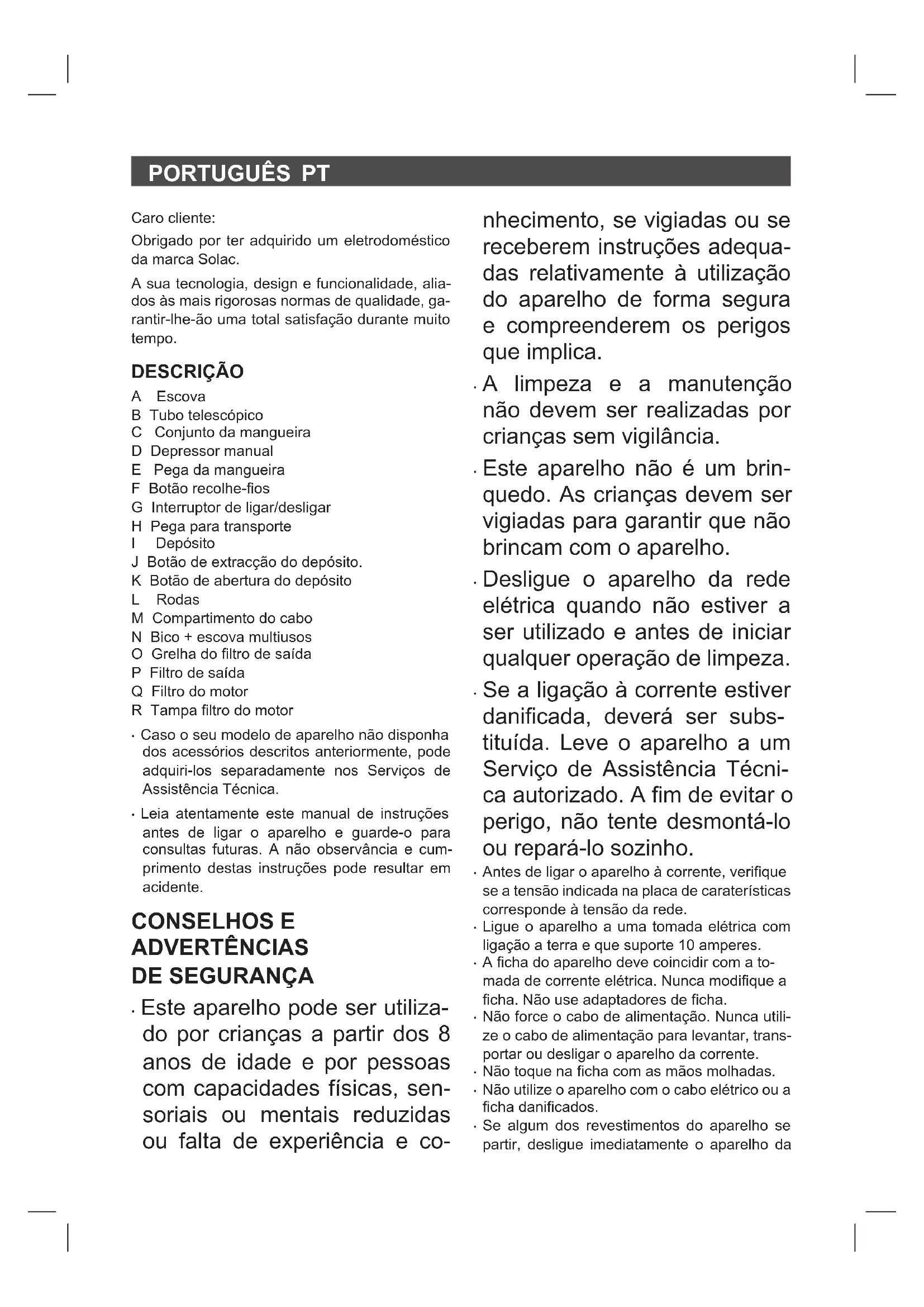 Caro cliente: Obrigado por ter adquirido um eletrodoméstico da marca Solac. A sua tecnologia, design e funcionalidade, alia- dos às mais rigorosas normas de qualidade, ga- rantir-lhe-ão uma total satisfação durante muito tempo. DESCRIÇÃO A Escova B Tubo telescópico C Conjunto da mangueira D Depressor manual E Pega da mangueira F Botão recolhe-os G Interruptor de ligar/desligar H Pega para transporte I Depósito J Botão de extracção do depósito. K Botão de abertura do depósito L Rodas M Compartimento do cabo N Bico + escova multiusos O Grelha do ltro de saída P Filtro de saída Q Filtro do motor R Tampa ltro do motor