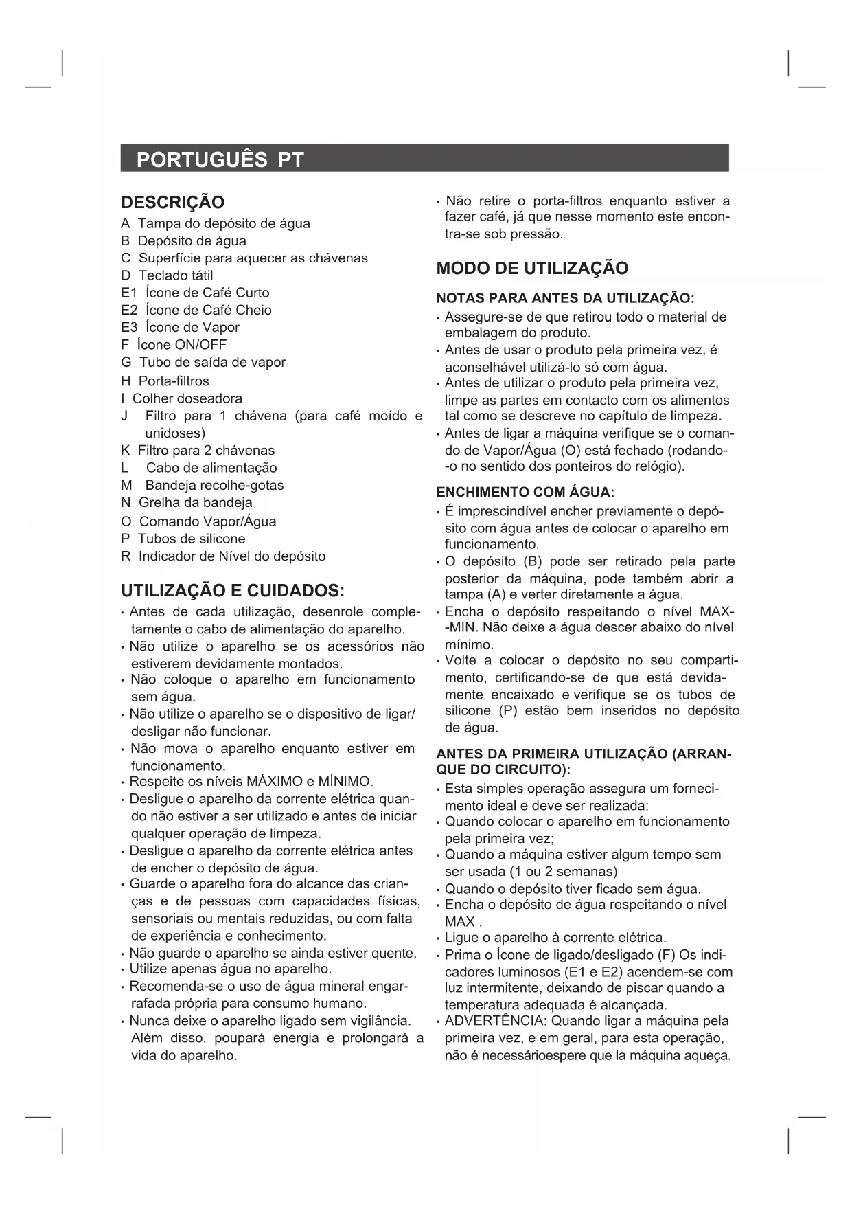 DESCRIÇÃO A Tampa do depósito de água B Depósito de água C Superfície para aquecer as chávenas D Teclado tátil E1 Ícone de Café Curto E2 Ícone de Café Cheio E3 Ícone de Vapor F Ícone ON/OFF G Tubo de saída de vapor H Porta-ltros I Colher doseadora J Filtro para 1 chávena (para café moído e unidoses) K Filtro para 2 chávenas L Cabo de alimentação M Bandeja recolhe-gotas N Grelha da bandeja O Comando Vapor/Água P Tubos de silicone R Indicador de Nível do depósito UTILIZAÇÃO E CUIDADOS: