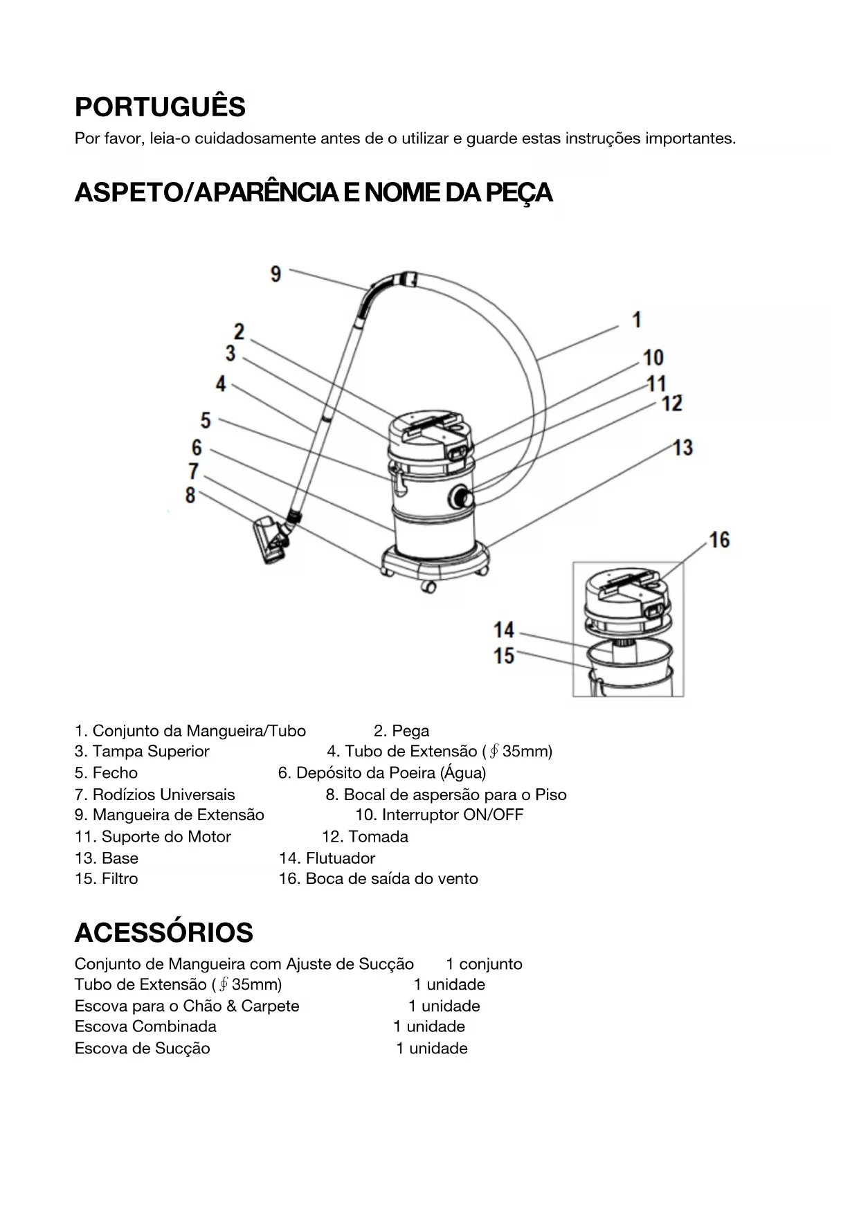 ACESSÓRIOS Conjunto de Mangueira com Ajuste de Sucção 1 conjunto Tubo de Extensão (∮35mm) 1 unidade Escova para o Chão & Carpete 1 unidade Escova Combinada 1 unidade Escova de Sucção 1 unidadeCARACTERÍSTICAS