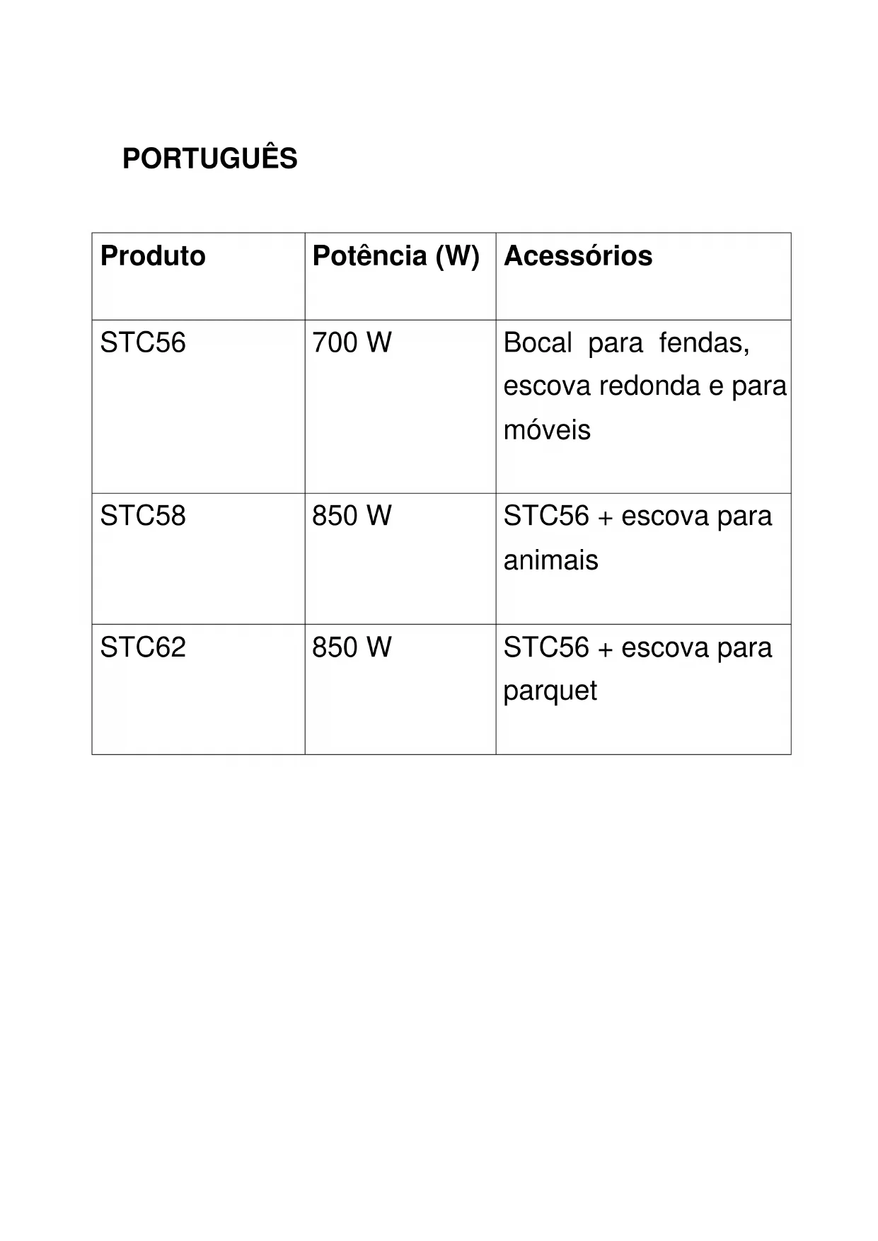 Produto Potência (W) Acessórios STC56 700 W Bocal para fendas, escova redonda e para móveis STC58 850 W STC56 + escova para animais STC62 850 W STC56 + escova para parquetCOMPONENTES DO APARELHO
