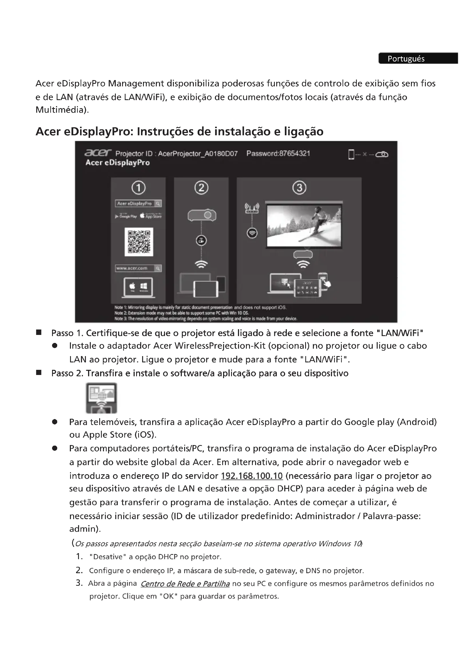 Portugués Acer eDisplayPro Management disponibiliza poderosas funções de controlo de exibição sem fios e de LAN (através de LAN/WiFi), e exibição de documentos/fotos locais (através da função Multimédia). Acer eDisplayPro: Instruções de instalação e ligação