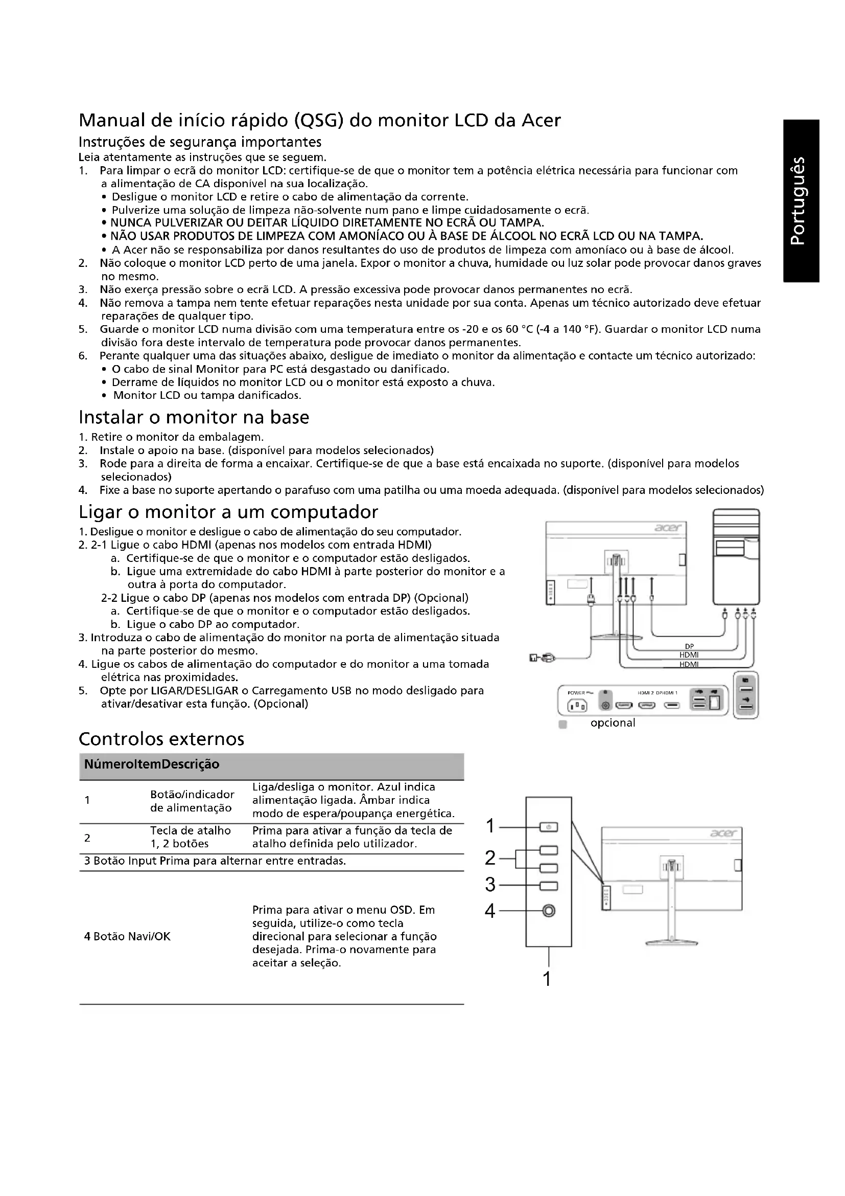 Português brasileiro Guia de início rápido do monitor LCD Acer Instruções de segurança importantes Leia as instruções a seguir atentamente.