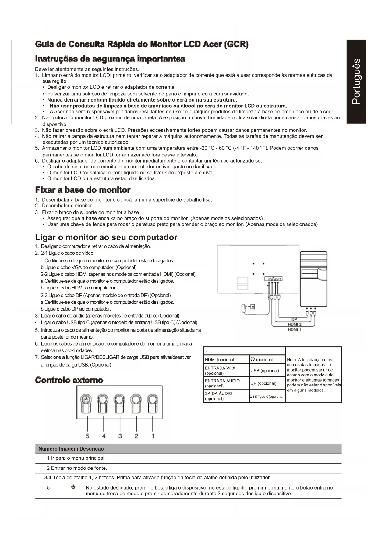 HDMI (somente modelo com entrada HDMI) (Opcional) Alto-falantes 2 W x 2 (Somente modelo com entrada de áudio) (Opcional) Tamanho máximo da tela Horizontal: 597 mm Vertical: 336 mm Fonte de Alimentação ENTRADA: 100-240 V ~ 50/60 Hz Considerações ambientais Temperatura de operação: 0 ° a 40 °C Temperatura de armazenamento: -20 ° a 60 °C Umidade de operação: 20% a 80% Dimensões 611(L) x 405~ 525 (A) x 234 (P) mm Peso (P. L.) 4,6 kg (líquido) Especificações do mecanismo Inclinação: -5° a +25° Articulação giratória: +/- 180° Regulagem de altura: 120 mm Pivô: Não Pé de suporte destacável: Sim Controles externos Interruptores/botões Botão liga/desliga Tecla de atalho 1 Tecla de atalho 2 Tecla de atalho 3 Tecla de atalho 4 Funções Brilho Contraste Nίvel de azul Aumento de Preto ACM HDR400 Super Nitidez Gama Temp. de cor Modos Espaço de Cor Modo Esc.Cinza Matiz 6-eixos Satur.6-eixos Volume Mudo Tx Reaç.Tela FreeSync Premium VRB Num taxa atualiz Latência Ultra Baixa Ponto alvo Idioma Tempo limite OSD Transparência Bloqueio OSD Entrada Fonte Auto Formato DP Wide Mode Designação de Atalho DDC/CI Nίvel preto HDMI Modo Início Ráp. Informação Redefinir Todas Config As especificações podem variar dependendo do modelo e/ou da região. Você pode encontrar os manuais e outros documentos do seu produto Acer no site oficial de suporte da Acer.Українська Посібник зі швидкого початку роботи з РК-монітором Acer Важливі інструкції з техніки безпеки Уважно прочитайте наведені нижче інструкції.