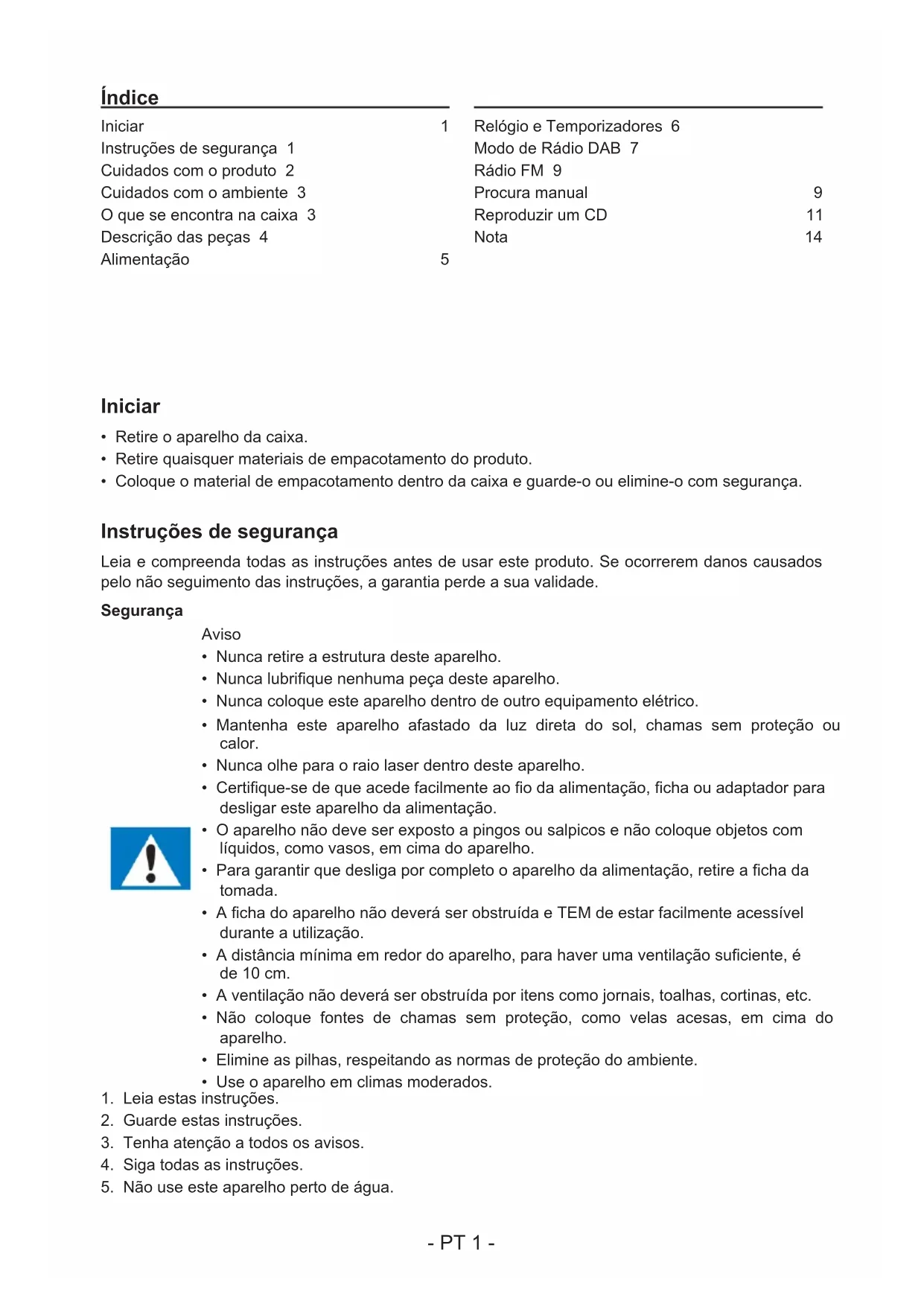 Iniciar 1 Instruções de segurança 1 Cuidados com o produto 2 Cuidados com o ambiente 3 O que se encontra na caixa 3 Descrição das peças 4 Alimentação 5 Relógio e Temporizadores 6 Modo de Rádio DAB 7 Rádio FM 9 Procura manual 9 Reproduzir um CD 11 Nota: 14