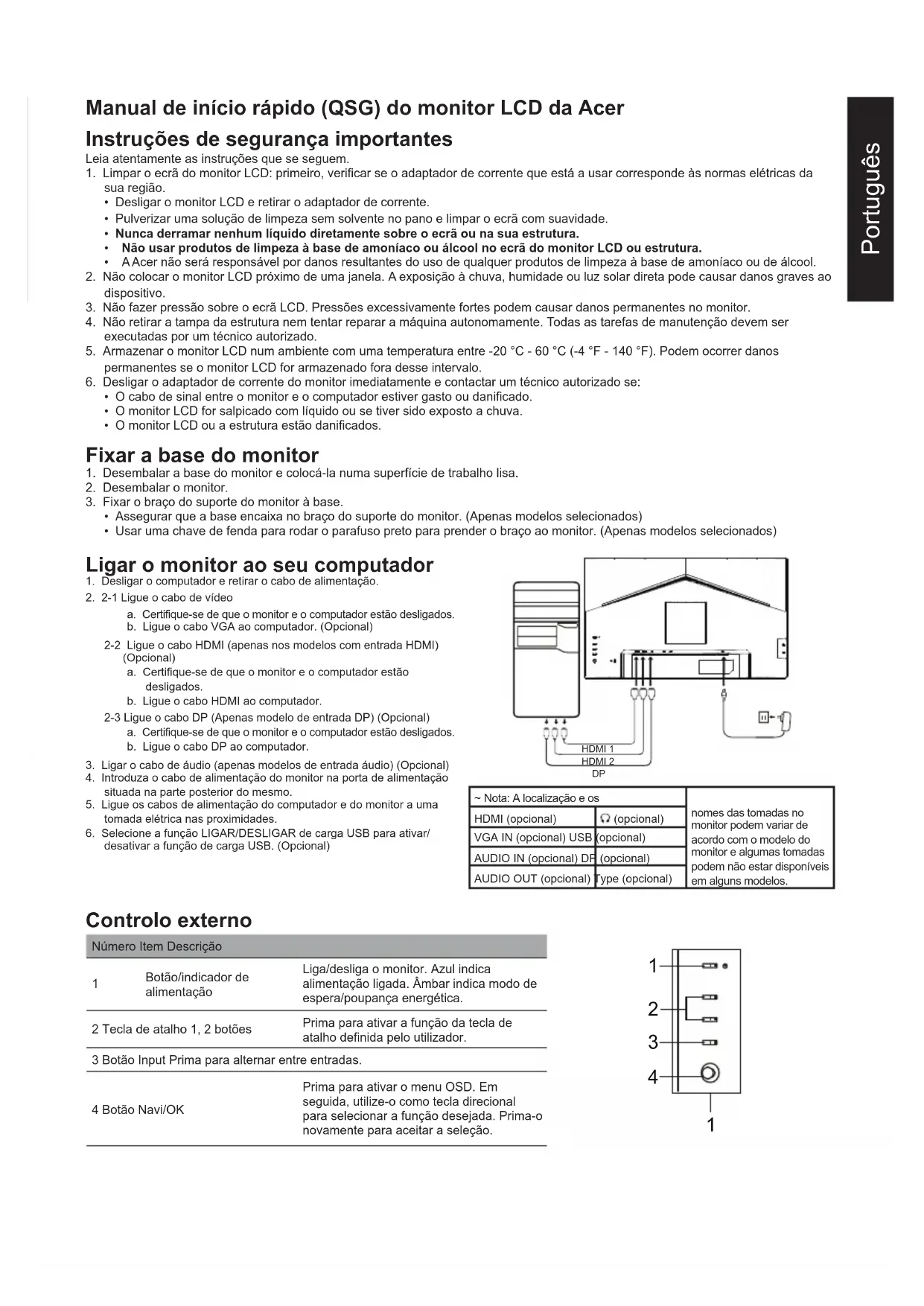 Consumo de energia Modo ligado 20 W (habitual) Modo de espera 0,5 W (habitual) Desligado 0,3 W (habitual) Conetor de entrada DP (apenas nos modelos com entrada DP) HDMI ×2 (Apenas Modelo com Entrada-HDMI) Sinal de entrada de vídeo DP (apenas nos modelos com entrada DP) HDMI ×2 (Apenas Modelo com Entrada-HDMI) Colunas 2 W × 2 USB USB3.0 × 4 (Opcional) Tamanho máximo do ecrã Horizontal: 597 mm Vertical: 336 mm Fonte de alimentação ENTRADA: 100-240 V~ 50/60 Hz Considerações ambientais Temperatura de funcionamento: 0° a 40°C Temperatura de armazenamento: -20° a 60°C Humidade em funcionamento: 20% a 80% Dimensões 610,5 (L) × 406-556 (A) × 247 (P) mm Peso (Líquido) 6,4 kg (líquido) Especificações do mecanismo Inclinação: -5° a +35° Rotação: ±60° Ajuste de altura: 150 mm Articulação: Não Base amovível: Sim Controlos externos Interruptor/Botões Botão de energia Tecla de atalho 1 Tecla de atalho 2 Entrada Menu/Navi/OK Funções Luminosidade Contraste Luz azul Intensif. preto ACM Super nitidez Gama Temp. Cor Modos Modo sRGB Modo esc. cinza Tonalid. 6 eixos Satur. 6 eixos Volume Sem som Taxa de reação Adaptive-Sync Núm freq atualiz Idioma Tempo limite OSD Transparência Bloquear OSD Entrada Fonte automática Modo Panorâmico Atribuição tecla atalho DDC/CI Nív. preto HDMI Modo início ráp. Carregamento USB no modo desligado Informação As especificações variam consoante o modelo e a região. Consultar os manuais e outros documentos do seu produto Acer no sítio web de suporte oficial da Acer.Русский Краткое руководство пользователя ЖК-монитора Acer Важные инструкции по технике безопасности Внимательно прочтите следующие инструкции.