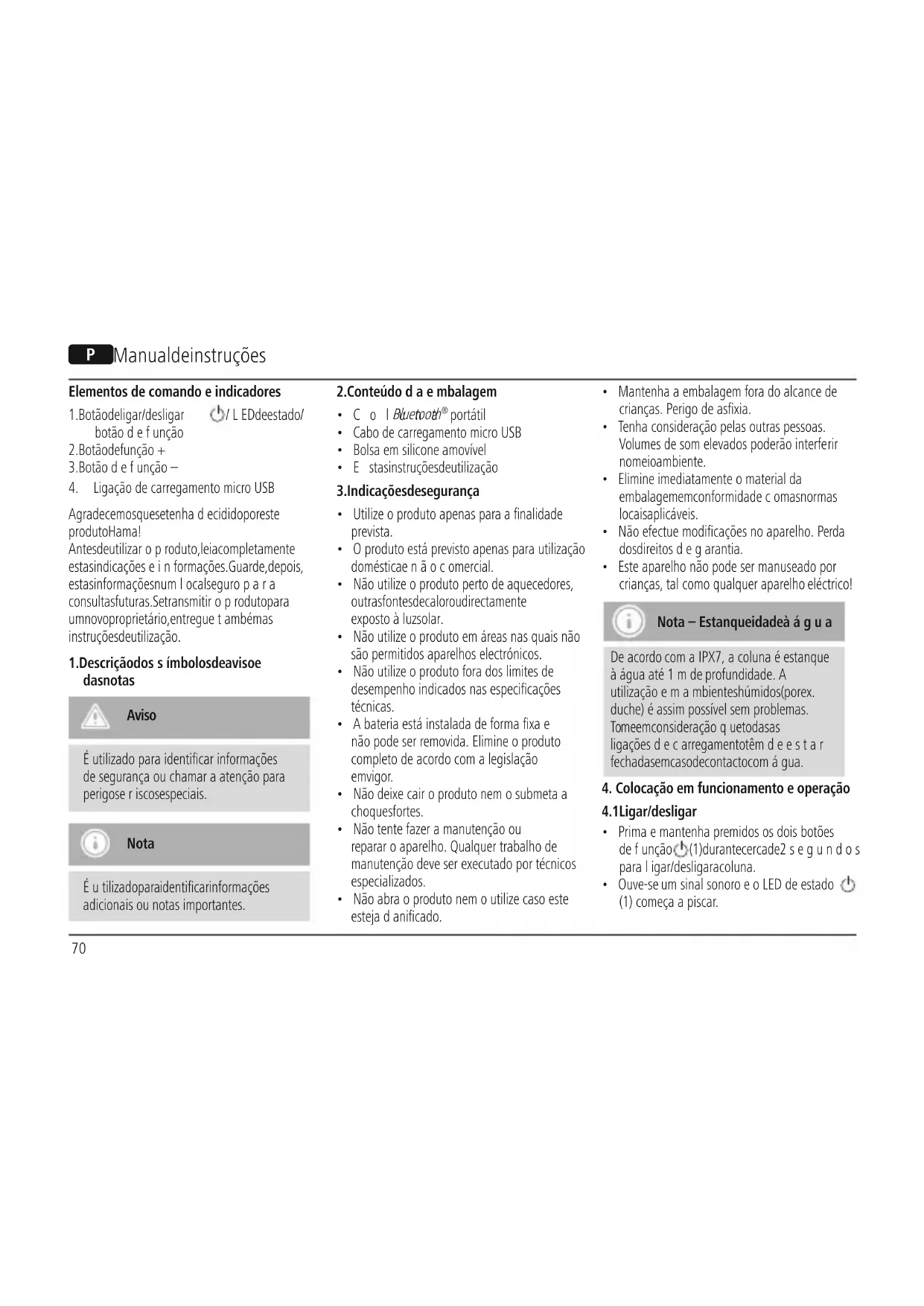 - Este aparelho nãopodeser manuseadopor crianças,tal como qualquerapar elho eléctrico! Nota–Estanqueidade àágua De acordo comaIPX7, acoluna éestanque àáguaaté 1mde profundidade.A utilizaçãoemambientes húmidos (por ex. duche) éassimpossívelsem problemas. Tome em consideraçãoque todasas ligaçõesdecarregamento têmdeestar fechadas em caso de contacto comágua.