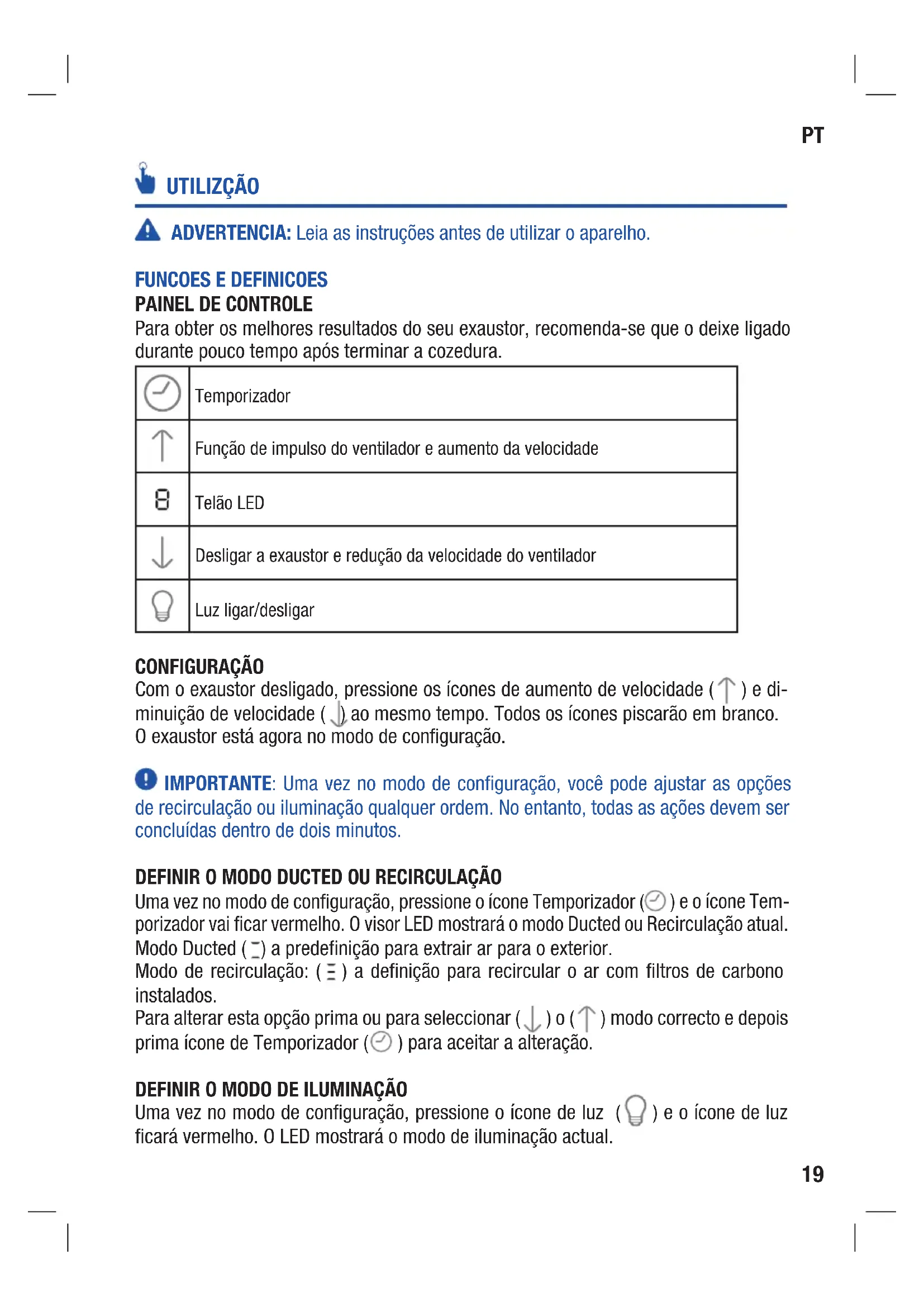Para obter os melhores resultados do seu exaustor, recomenda-se que o deixe ligado durante pouco tempo após terminar a cozedura. Temporizador Função de impulso do ventilador e aumento da velocidade Telão LED Desligar a exaustor e redução da velocidade do ventilador Luz ligar/desligar CONFIGURAÇÃO Com o exaustor desligado, pressione os ícones de aumento de velocidade ( ) e di- minuição de velocidade ( ) ao mesmo tempo. Todos os ícones piscarão em branco. O exaustor está agora no modo de configuração. IMPORTANTE: Uma vez no modo de configuração, você pode ajustar as opções de recirculação ou iluminação qualquer ordem. No entanto, todas as ações devem ser concluídas dentro de dois minutos. DEFINIR O MODO DUCTED OU RECIRCULAÇÃO Uma vez no modo de configuração, pressione o ícone Temporizador ( ) e o ícone Tem- porizador vai ficar vermelho. O visor LED mostrará o modo Ducted ou Recirculação atual. Modo Ducted ( ) a predefinição para extrair ar para o exterior. Modo de recirculação: ( ) a definição para recircular o ar com filtros de carbono instalados. Para alterar esta opção prima ou para seleccionar ( ) o ( ) modo correcto e depois prima ícone de Temporizador ( ) para aceitar a alteração.