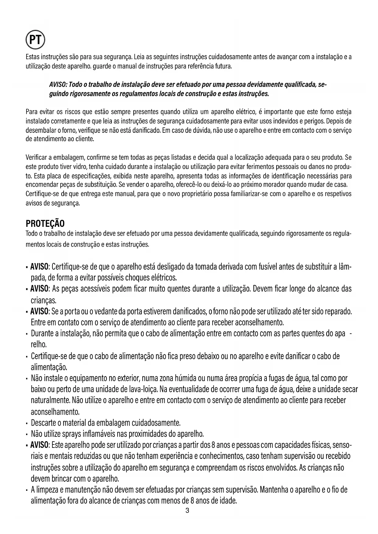 - After cleaning, replace the door (5) in the reverse order. 35FAQS olution What should I do if the oven does not heat up? Check to see if one of the following actions resolves the issue: The oven may not be switched on. Switch on the oven. f). Check to see if the required settings have been applied. A household fuse may have blown or a circuit breaker may have tripped. Replace the fuses or reset the circuit. If this happens repeatedly, call the Service Centre. What should I do if, even though the oven function and temperature have been set, the oven does not heat up? There may be problems with the internal electrical components. Call the Service Centre. What should I do if I cannot change the set temperature? Make sure to have used the temperature knob What should I do if the oven light does not illuminate? The oven light is faulty . Replace the oven light bulb The grill does not heat up properly? The grill power is set too lo w. Turn the temperature control to a higher temperature. TROUBLE SHOOTING 36Estas instruções são para sua segurança. Leia as seguintes instruções cuidadosamente antes de avançar com a instalação e a utilização deste aparelho. guarde o manual de instruções para referência futura. AVISO: Todo o trabalho de instalação deve ser efetuado por uma pessoa devidamente qualificada, se- guindo rigorosamente os regulamentos locais de construção e estas instruções. Para evitar os riscos que estão sempre presentes quando utiliza um aparelho elétrico, é importante que este forno esteja instalado corretamente e que leia as instruções de segurança cuidadosamente para evitar usos indevidos e perigos. Depois de desembalar o forno, verifique se não está danificado. Em caso de dúvida, não use o aparelho e entre em contacto com o serviço de atendimento ao cliente. Verificar a embalagem, confirme se tem todas as peças listadas e decida qual a localização adequada para o seu produto. Se este produto tiver vidro, tenha cuidado durante a instalação ou utilização para evitar ferimentos pessoais ou danos no produ- to. Esta placa de especificações, exibida neste aparelho, apresenta todas as informações de identificação necessárias para encomendar peças de substituição. Se vender o aparelho, oferecê-lo ou deixá-lo ao próximo morador quando mudar de casa. Certifique-se de que entrega este manual, para que o novo proprietário possa familiarizar-se com o aparelho e os respetivos avisos de segurança. PROTEÇÃO Todo o trabalho de instalação deve ser efetuado por uma pessoa devidamente qualificada, seguindo rigorosamente os regula- mentos locais de construção e estas instruções.