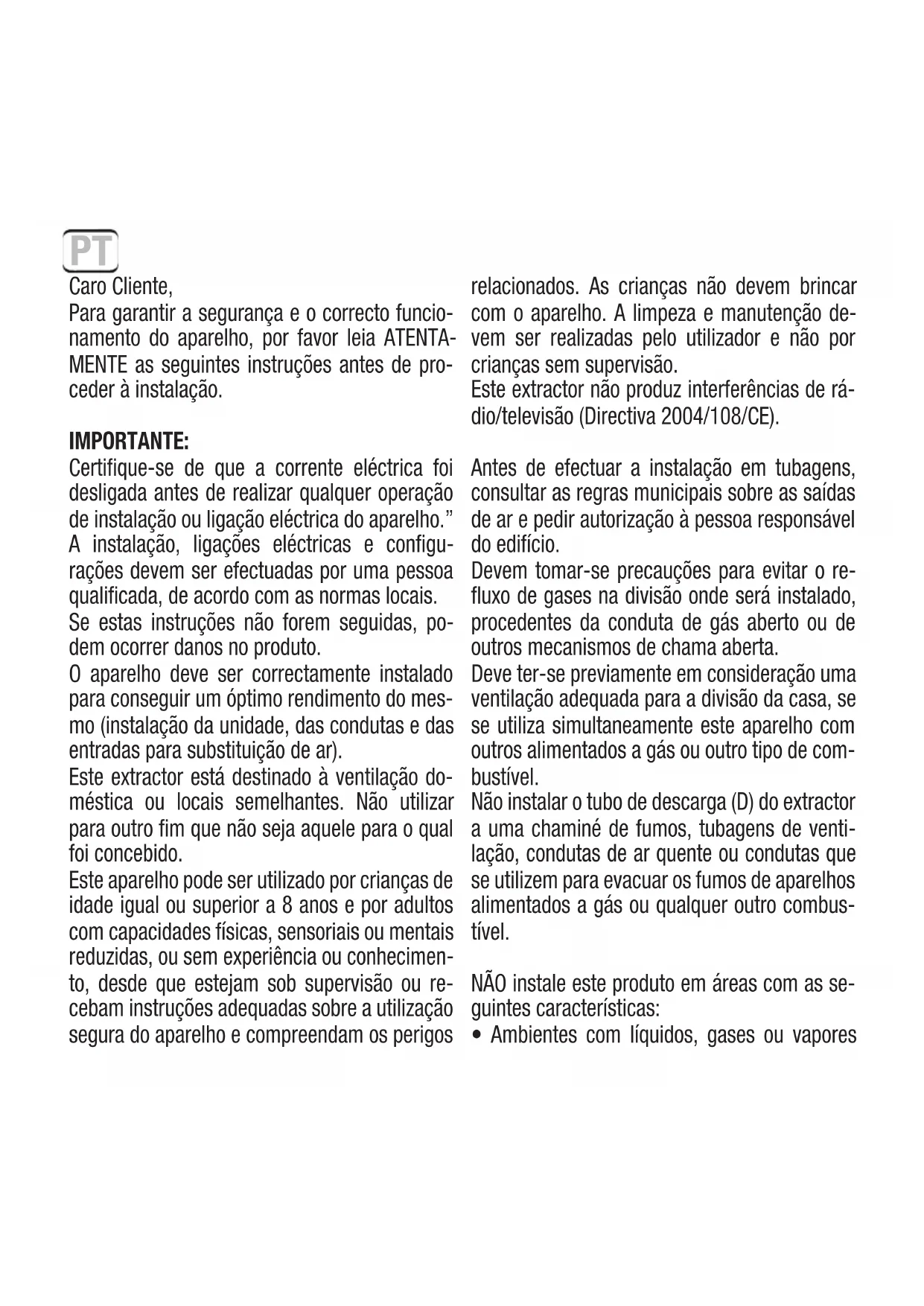 - Ambientes com líquidos, gases ou vapores Caro Cliente, Para garantir a segurança e o correcto funcio- namento do aparelho, por favor leia ATENTA- MENTE as seguintes instruções antes de pro- ceder à instalação. IMPORTANTE: Certifique-se de que a corrente eléctrica foi desligada antes de realizar qualquer operação de instalação ou ligação eléctrica do aparelho.” A instalação, ligações eléctricas e configu- rações devem ser efectuadas por uma pessoa qualificada, de acordo com as normas locais. Se estas instruções não forem seguidas, po- dem ocorrer danos no produto. O aparelho deve ser correctamente instalado para conseguir um óptimo rendimento do mes- mo (instalação da unidade, das condutas e das entradas para substituição de ar). Este extractor está destinado à ventilação do- méstica ou locais semelhantes. Não utilizar para outro fim que não seja aquele para o qual foi concebido. Este aparelho pode ser utilizado por crianças de idade igual ou superior a 8 anos e por adultos com capacidades físicas, sensoriais ou mentais reduzidas, ou sem experiência ou conhecimen- to, desde que estejam sob supervisão ou re- cebam instruções adequadas sobre a utilização segura do aparelho e compreendam os perigos PTcorrosivos, explosivos ou inflamáveis.