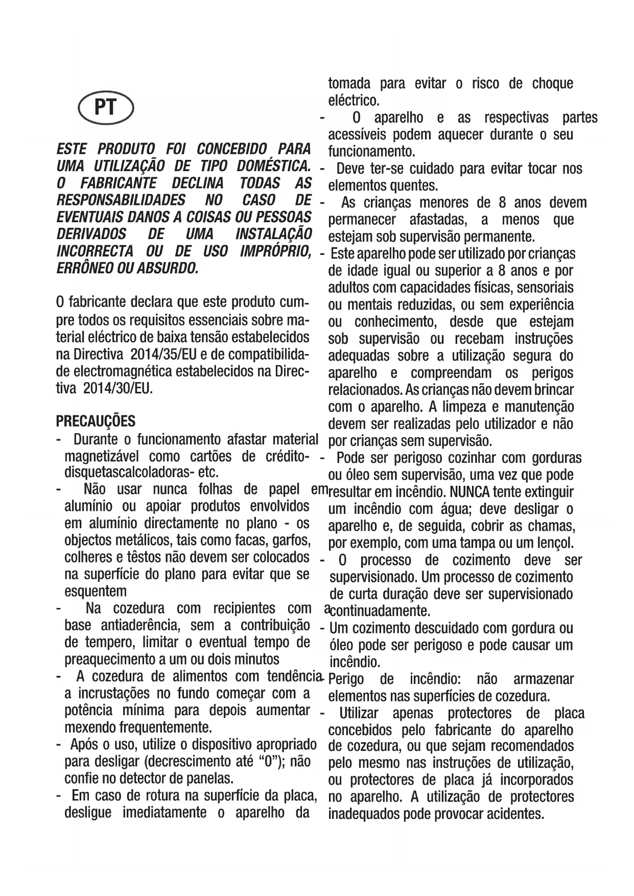 de electromagnética estabelecidos na Direc- tiva 2014/30/EU. PRECAUÇÕES - Durante o funcionamento afastar material magnetizável como cartões de crédito- disquetascalcoladoras- etc. - Não usar nunca folhas de papel em alumínio ou apoiar produtos envolvidos em alumínio directamente no plano - os objectos metálicos, tais como facas, garfos, colheres e têstos não devem ser colocados na superfície do plano para evitar que se esquentem - Na cozedura com recipientes com a base antiaderência, sem a contribuição de tempero, limitar o eventual tempo de preaquecimento a um ou dois minutos - A cozedura de alimentos com tendência a incrustações no fundo começar com a potência mínima para depois aumentar mexendo frequentemente. - Após o uso, utilize o dispositivo apropriado para desligar (decrescimento até “0”); não confie no detector de panelas. - Em caso de rotura na superfície da placa, desligue imediatamente o aparelho da tomada para evitar o risco de choque eléctrico. - O aparelho e as respectivas partes acessíveis podem aquecer durante o seu funcionamento. - Deve ter-se cuidado para evitar tocar nos elementos quentes. - As crianças menores de 8 anos devem permanecer afastadas, a menos que estejam sob supervisão permanente. - Este aparelho pode ser utilizado por crianças de idade igual ou superior a 8 anos e por adultos com capacidades físicas, sensoriais ou mentais reduzidas, ou sem experiência ou conhecimento, desde que estejam sob supervisão ou recebam instruções adequadas sobre a utilização segura do aparelho e compreendam os perigos relacionados. As crianças não devem brincar com o aparelho. A limpeza e manutenção devem ser realizadas pelo utilizador e não por crianças sem supervisão. - Pode ser perigoso cozinhar com gorduras ou óleo sem supervisão, uma vez que pode resultar em incêndio. NUNCA tente extinguir um incêndio com água; deve desligar o aparelho e, de seguida, cobrir as chamas, por exemplo, com uma tampa ou um lençol. - O processo de cozimento deve ser supervisionado. Um processo de cozimento de curta duração deve ser supervisionado continuadamente. - Um cozimento descuidado com gordura ou óleo pode ser perigoso e pode causar um incêndio. - Perigo de incêndio: não armazenar elementos nas superfícies de cozedura. - Utilizar apenas protectores de placa concebidos pelo fabricante do aparelho de cozedura, ou que sejam recomendados pelo mesmo nas instruções de utilização, ou protectores de placa já incorporados no aparelho. A utilização de protectores inadequados pode provocar acidentes. PTIntroduzir na cablagem fixa uma forma de desligar da fonte de alimentação com uma separação de contacto em todos os pólos que permitem desligar totalmente conforme as condições de categoria III de sobretensão, de acordo com as regras de ligação. A tomada ou o interruptor onipolar deverão ser posicionados para uma fácil manipulação do aparelho instalado. Este aparelho não está preparado para poder funcionar por meio de um temporizador externo ou sistema de controlo remoto separado. O construtor declina qualquer responsabili