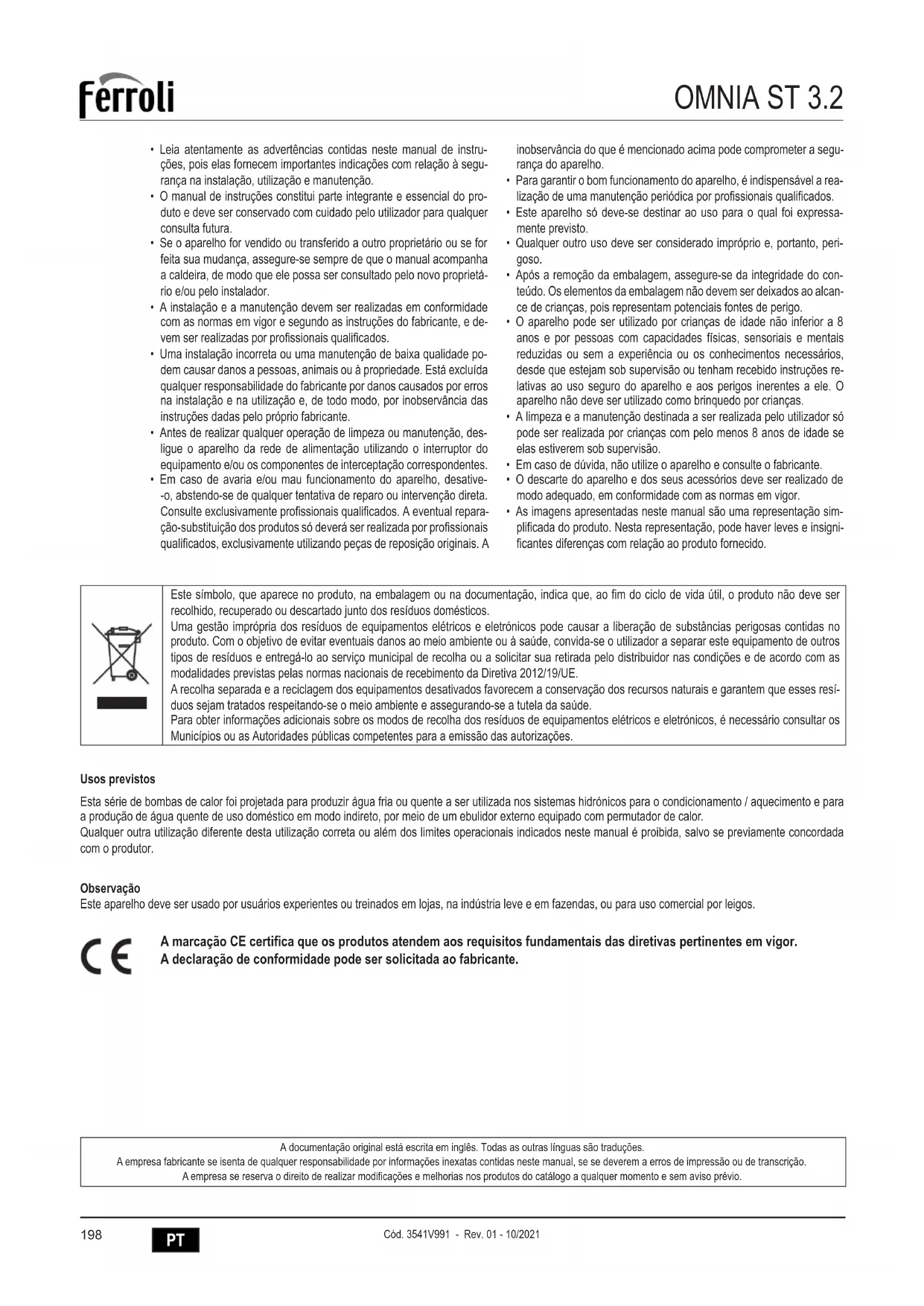 Cód. 3541V991 - Rev. 01 - 10/2021 OMNIA ST 3.2 Para o pedido da aplicação da garantia, é essencial preencher todas os dados assinalados no Certificado de Garantia anexo. A validação da Garantia deve ser feita digitando a data da compra e enviando-a para a FERROLI. As eventuais reclamações deverão ser efetuadas ao organismo competente nesta matéria. O pedido de aplicação da garantia será feito mediante a apresentação do recibo da garantia fornecido com a documentação do equipamento, juntamente com a nota de entrega do equipamento afetado e a fatura de compra no momento de qualquer intervenção do Serviço Técnico da Ferroli Os sistemas especiais de acessibilidade aos dispositivos, como andaimes, elevadores etc., serão fornecidos pelo cliente. As peças substituídas durante o período da Garantia permanecerão sob custódia e propriedade da FERROLI, sendo a entrega obrigatória. Esta Garantia não entrará em vigor se não forem cumpridas as condições gerais de venda das unidades especificadas pela FERROLI. Os danos causados durante o transporte ou a instalação do equipamento não estão incluídos na Garantia. Os defeitos observados serão relatados imediatamente à empresa de transporte. Qualquer defeito observado por golpes antes da descarga do equipamento e sua subsequente receção pelo cliente devem ser notificados por escrito e detalhados ao SAT Central da FERROLI dentro de 24 horas, de acordo com a data indicada na nota de entrega . Na falta do registo de tal reclamação, a FERROLI não assumirá as despesas causadas por tais danos. O Serviço Técnico da FERROLI não executará nenhum tipo de reparação em equipamentos instalados que estejam em violação da legislação vigente, em locais de difícil ou impossível acesso ou em locais perigosos para o operário. O equipamento será reparado quando o equipamento tiver sido previamente desinstalado pelo cliente. A FERROLI não se responsabiliza pelos custos de desinstalação e instalação do equipamento. A FERROLI declina toda a responsabilidade que possa surgir de eventos extraordinários, como os que podem surgir em casos de "Força Maior" (incêndio, desastres naturais, restrições governamentais, etc.). Em qualquer caso, a Garantia será aplicada conforme indicado neste documento e será obrigatório no momento de qualquer intervenção do Serviço Técnico Oficial da FERROLI, a apresentação da nota de entrega do equipamento e da fatura de compra. SERVIÇO DE ASSISTÊNCIA TÉCNICA LINHA AZUL DO CENTRO DE ATENDIMENTO DISPONIVEL 24 HORAS, DURANTE TODO O ANO De telemovel marque: PORTO: 227 863 050 e LISBOA: 210 537 240