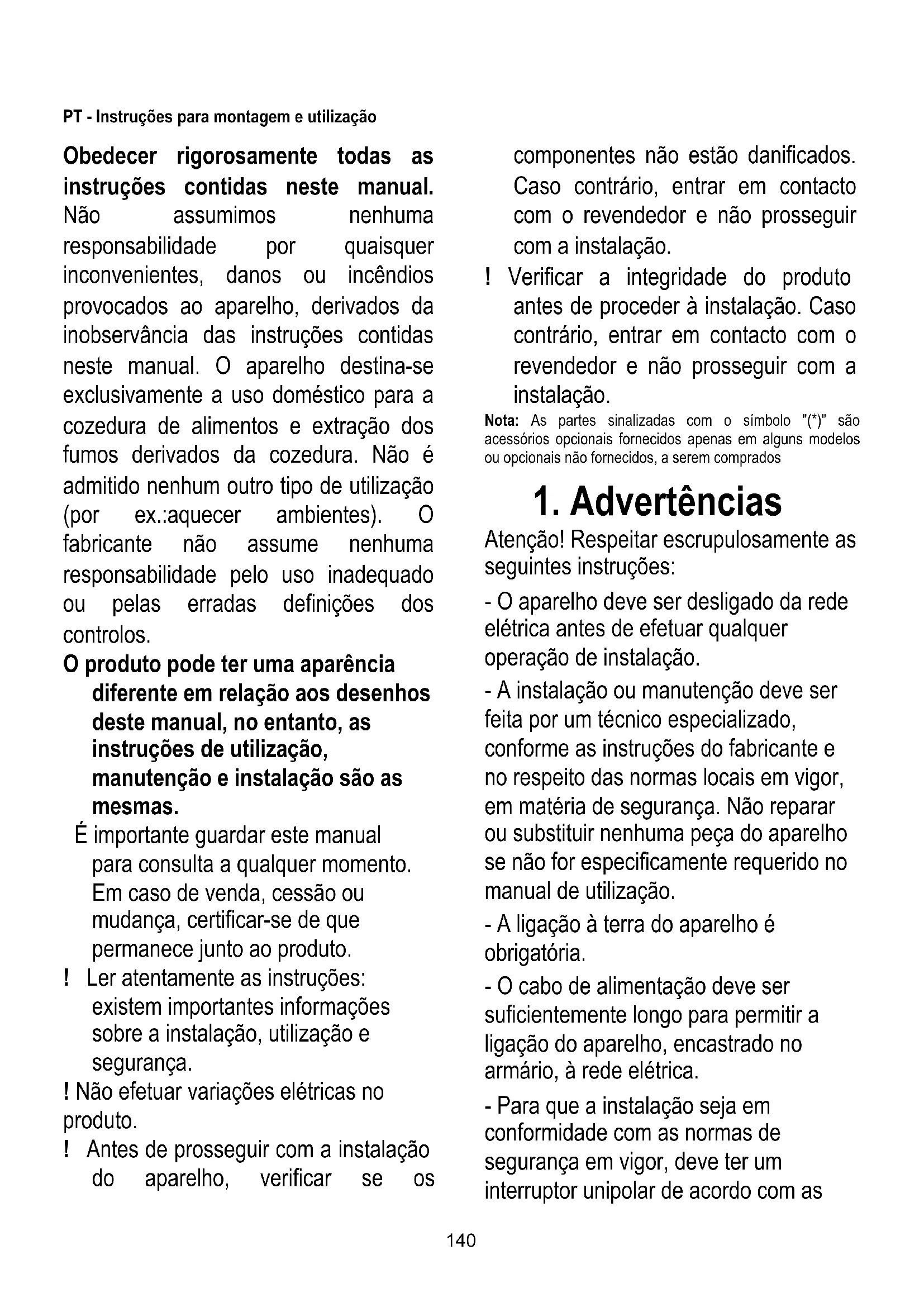 Si tras realizar las verificaciones arriba descritas, el problema persiste, contacte con el Servicio de Asistencia técnica más cercano.140 PT - Instruções para montagem e utilização Obedecer rigorosamente todas as instruções contidas neste manual. Não assumimos nenhuma responsabilidade por quaisquer inconvenientes, danos ou incêndios provocados ao aparelho, derivados da inobservância das instruções contidas neste manual. O aparelho destina-se exclusivamente a uso doméstico para a cozedura de alimentos e extração dos fumos derivados da cozedura. Não é admitido nenhum outro tipo de utilização (por ex.:aquecer ambientes). O fabricante não assume nenhuma responsabilidade pelo uso inadequado ou pelas erradas definições dos controlos. O produto pode ter uma aparência diferente em relação aos desenhos deste manual, no entanto, as instruções de utilização, manutenção e instalação são as mesmas. É importante guardar este manual para consulta a qualquer momento. Em caso de venda, cessão ou mudança, certificar-se de que permanece junto ao produto. ! Ler atentamente as instruções: existem importantes informações sobre a instalação, utilização e segurança. ! Não efetuar variações elétricas no produto. ! Antes de prosseguir com a instalação do aparelho, verificar se os componentes não estão danificados. Caso contrário, entrar em contacto com o revendedor e não prosseguir com a instalação. ! Verificar a integridade do produto antes de proceder à instalação. Caso contrário, entrar em contacto com o revendedor e não prosseguir com a instalação. Nota: As partes sinalizadas com o símbolo "(*)" são acessórios opcionais fornecidos apenas em alguns modelos ou opcionais não fornecidos, a serem comprados