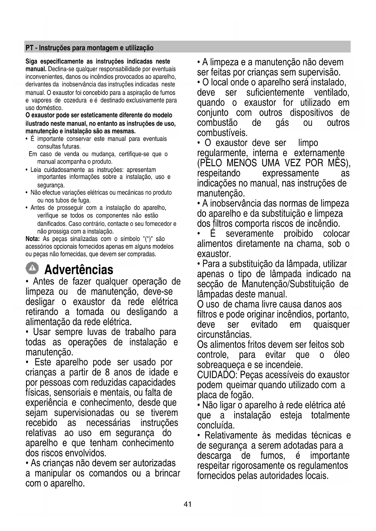 - Antes de prosseguir com a instalação do aparelho, verifique se todos os componentes não estão danificados. Caso contrário, contacte o seu fornecedor e não prossiga com a instalação. Nota: As peças sinalizadas com o símbolo "(*)" são acessórios opcionais fornecidos apenas em alguns modelos ou peças não fornecidas, que devem ser compradas. Advertências