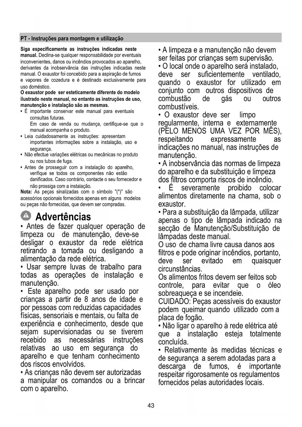 - Para a substituição da lâmpada, utilizar apenas o tipo de lâmpada indicado na secção de Manutenção/Substituição de lâmpadas deste manual. O uso de chama livre causa danos aos filtros e pode originar incêndios, portanto, deve ser evitado em quaisquer circunstâncias. Os alimentos fritos devem ser feitos sob controle, para evitar que o óleo sobreaqueça e se incendeie. CUIDADO: Peças acessíveis do exaustor podem queimar quando utilizado com a placa de fogão.