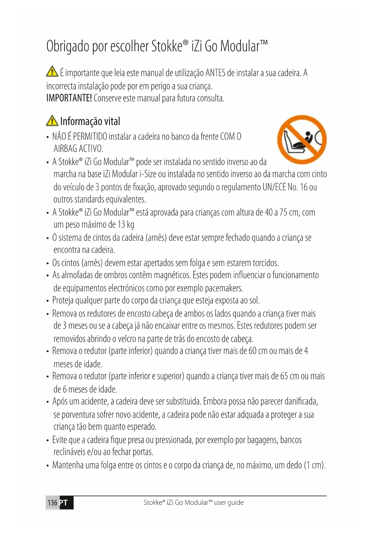- A Stokke® iZi Go Modular™ pode ser instalada no sentido inverso ao da marcha na base iZi Modular i-Size ou instalada no sentido inverso ao da marcha com cinto do veículo de 3 pontos de xação, aprovado segundo o regulamento UN/ECE No. 16 ou outros standards equivalentes.