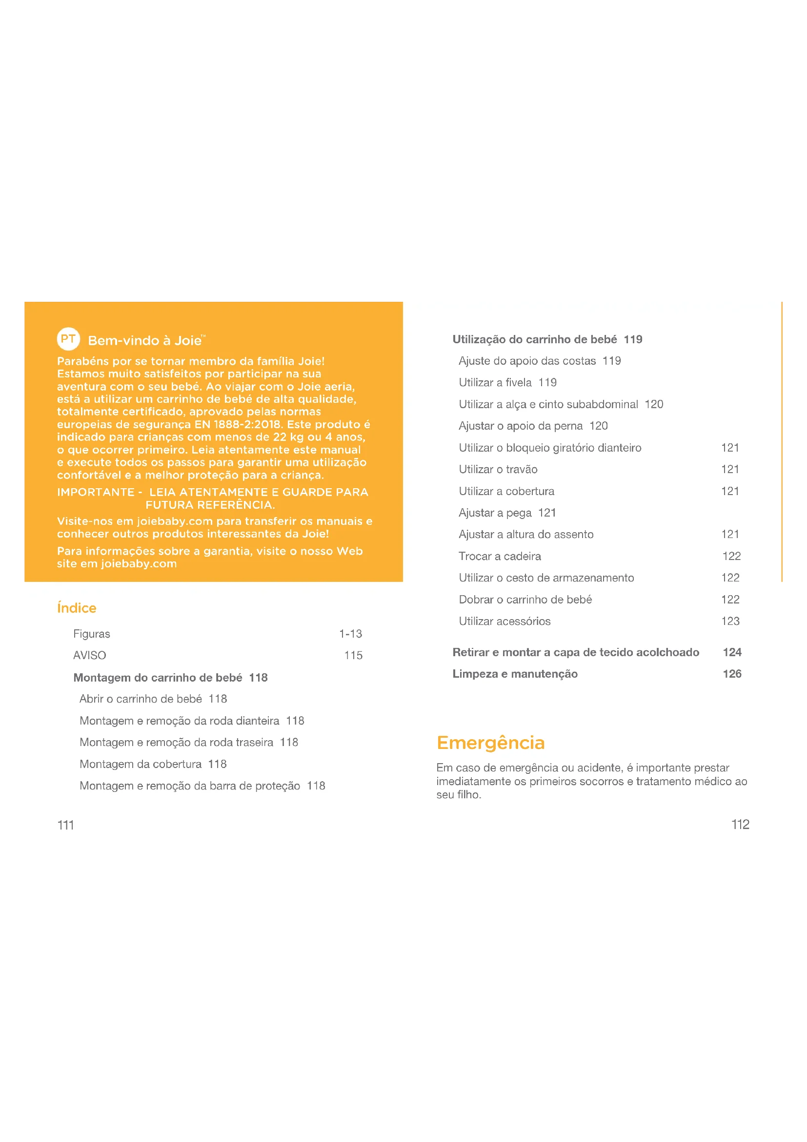 Parabéns por se tornar membro da família Joie! Estamos muito satisfeitos por participar na sua aventura com o seu bebé. Ao viajar com o Joie aeria, está a utilizar um carrinho de bebé de alta qualidade, totalmente certificado, aprovado pelas normas europeias de segurança EN 1888-2:2018. Este produto é indicado para crianças com menos de 22 kg ou 4 anos, o que ocorrer primeiro. Leia atentamente este manual e execute todos os passos para garantir uma utilização confortável e a melhor proteção para a criança. IMPORTANTE - LEIA ATENTAMENTE E GUARDE PARA FUTURA REFERÊNCIA. Visite-nos em joiebaby.com para transferir os manuais e conhecer outros produtos interessantes da Joie! Para informações sobre a garantia, visite o nosso Web site em joiebaby.com Índice Figuras 1-13 AVISO 115 Montagem do carrinho de bebé 118 Abrir o carrinho de bebé 118 Montagem e remoção da roda dianteira 118 Montagem e remoção da roda traseira 118 Montagem da cobertura 118 Montagem e remoção da barra de proteção 118 Utilização do carrinho de bebé 119 Ajuste do apoio das costas 119 Utilizar a fivela 119 Utilizar a alça e cinto subabdominal 120 Ajustar o apoio da perna 120 Utilizar o bloqueio giratório dianteiro 121 Utilizar o travão 121 Utilizar a cobertura 121 Ajustar a pega 121 Ajustar a altura do assento 121 Trocar a cadeira 122 Utilizar o cesto de armazenamento 122 Dobrar o carrinho de bebé 122 Utilizar acessórios 123 Retirar e montar a capa de tecido acolchoado 124 Limpeza e manutenção 126 Emergência Em caso de emergência ou acidente, é importante prestar imediatamente os primeiros socorros e tratamento médico ao seu filho.113