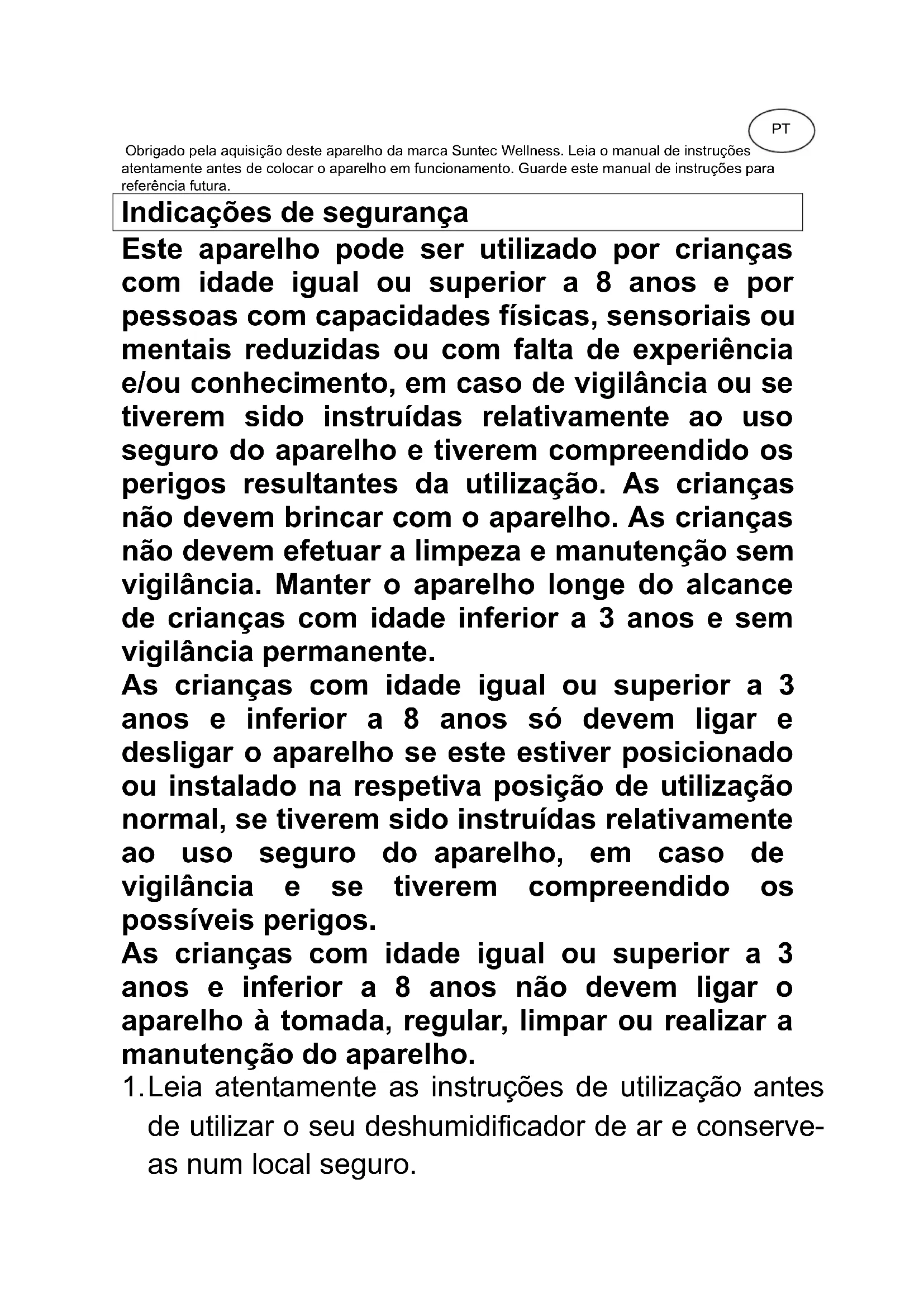 DryFix SUNTEC WELLNESS GMBH / HOLZSTRASSE 2 / 40 221 DÜSSELDORF / DEUTSCHLANDPT Obrigado pela aquisição deste aparelho da marca Suntec Wellness. Leia o manual de instruções atentamente antes de colocar o aparelho em funcionamento. Guarde este manual de instruções para referência futura. Indicações de segurança Este aparelho pode ser utilizado por crianças com idade igual ou superior a 8 anos e por pessoas com capacidades físicas, sensoriais ou mentais reduzidas ou com falta de experiência e/ou conhecimento, em caso de vigilância ou se tiverem sido instruídas relativamente ao uso seguro do aparelho e tiverem compreendido os perigos resultantes da utilização. As crianças não devem brincar com o aparelho. As crianças não devem efetuar a limpeza e manutenção sem vigilância. Manter o aparelho longe do alcance de crianças com idade inferior a 3 anos e sem vigilância permanente. As crianças com idade igual ou superior a 3 anos e inferior a 8 anos só devem ligar e desligar o aparelho se este estiver posicionado ou instalado na respetiva posição de utilização normal, se tiverem sido instruídas relativamente ao uso seguro do aparelho, em caso de vigilância e se tiverem compreendido os possíveis perigos. As crianças com idade igual ou superior a 3 anos e inferior a 8 anos não devem ligar o aparelho à tomada, regular, limpar ou realizar a manutenção do aparelho.