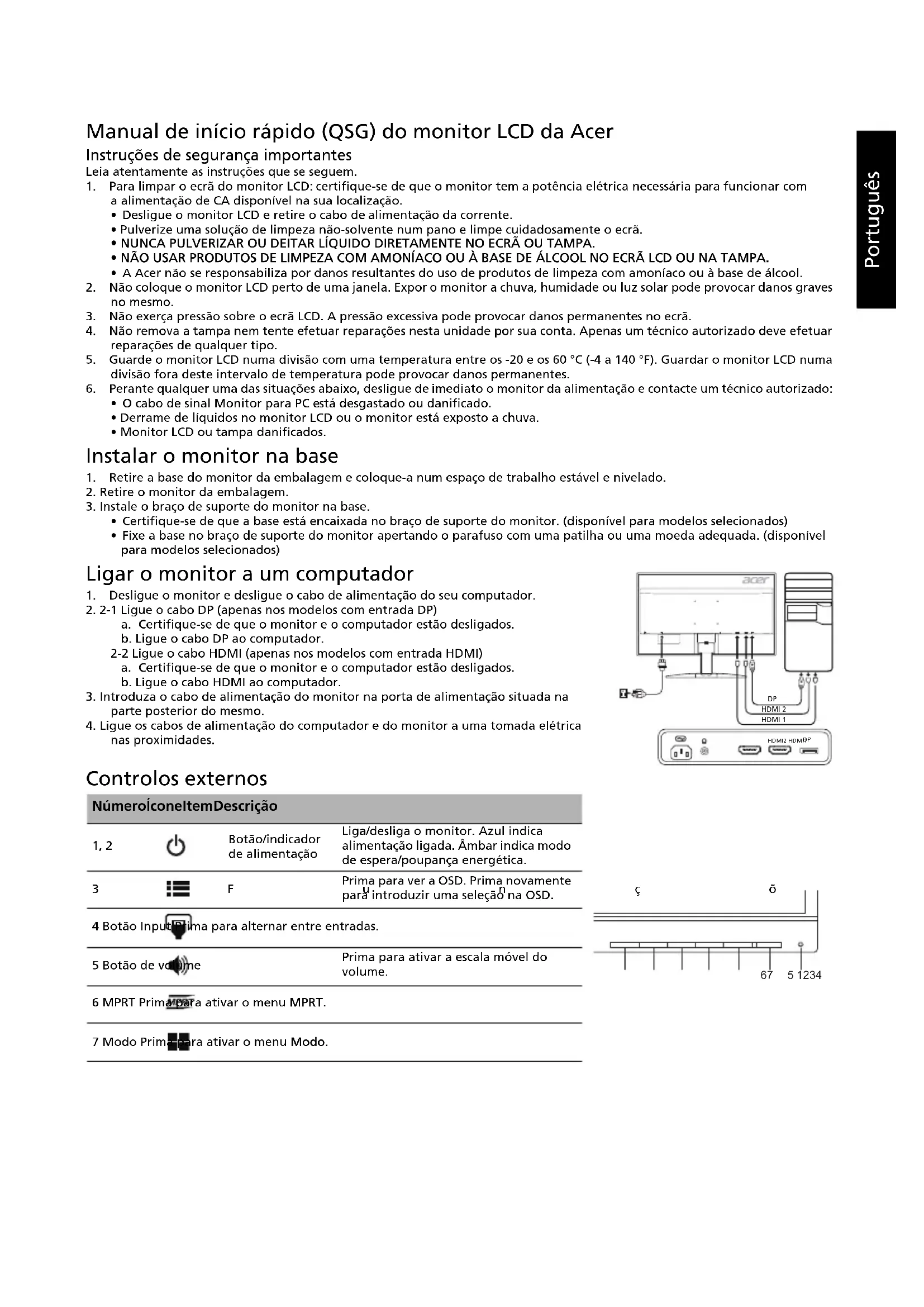 nas proximidades. Controlos externos Número Ícone Item Descrição 1, 2 Botão/indicador de alimentação Liga/desliga o monitor. Azul indica alimentação ligada. Âmbar indica modo de espera/poupança energética. 3Funções da OSD Prima para ver a OSD. Prima novamente para introduzir uma seleção na OSD. 4 Botão Input Prima para alternar entre entradas. 5 Botão de volume Prima para ativar a escala móvel do volume. 6 MPRT Prima para ativar o menu MPRT. 7 Modo Prima para ativar o menu Modo. HDMI 2 HDMI 1 HDMI2 HDMI1 1234567Português Regulamentações e avisos de segurança Aviso da FCC Este dispositivo foi testado e considera-se estar em conformidade com os limites estabelecidos para um dispositivo digital de Classe B, estando de acordo com a secção 15 das normas da FCC. Estes limites foram concebidos para oferecer uma proteção razoável contra interferências indesejáveis numa instalação residencial. Este equipamento gera, utiliza e pode emitir radiofrequências e, se não for instalado e utilizado de acordo com as instruções, pode causar interferências nocivas nas comunicações por rádio. No entanto, não existe qualquer garantia de que a interferência não ocorra numa instalação particular. Se este dispositivo provocar interferências nocivas na receção de rádio ou televisão, facto que pode determinar ligando e desligando o dispositivo, recomenda-se que o utilizador corrija as mesmas, recorrendo a uma ou mais das seguintes medidas: Reorientar ou reposicionar a antena recetora. Aumentar a distância entre o dispositivo e o recetor. Ligar o dispositivo a uma tomada de parede num circuito diferente daquele ao qual o recetor está ligado. Consultar o fornecedor ou um técnico de rádio/televisão experiente para obter ajuda. Declaração de conformidade da CE Pelo presente documento, a Acer Inc. declara que este monitor LCD se encontra em conformidade com os requisitos essenciais e outras disposições relevantes da Diretiva relativa à EMC (Compatibilidade Eletromagnética) 2014/30/UE, da Diretiva para Equipamentos de Baixa Tensão 2014/35/UE, da Diretiva relativa à RoHS (Restrição de Certas Substâncias Perigosas) 2011/65/UE e da Diretiva 2009/125/CE com vista a estabelecer um quadro de referência para a definição dos requisitos de ecodesign para produtos relacionados com o consumo energético. Aviso: Para evitar danificar o monitor, não o levante pela base. Aviso: cabos blindados É obrigatório de estabelecer todas as ligações a outros dispositivos informáticos através de cabos blindados, de forma a manter a conformidade com as regulamentações da EMC. Aviso: dispositivos periféricos Só pode ligar periféricos (dispositivos de entrada/saída, terminais, impressoras, etc.) certificados em conformidade com os limites da Classe B a este equipamento. É provável que a utilização com periféricos não-certificados provoque interferências na receção de rádio e televisão. Atenção Quaisquer alterações ou modificações que não sejam expressamente aprovadas pelo fabricante podem anular a autoridade do utilizador, concedida pela FCC (Federal Communications Commission – Comissão Federal de Comunicações), no que respeita à utilização deste produto. Condições de funcionamento Este dispositivo está em conformidade com a Parte 15 das normas de FCC. O funcionamento está sujeito às duas condições que se seguem: (1) este dispositivo não pode provocar interferências nocivas e (2) este dispositivo tem de aceitar quaisquer interferências recebidas, incluindo interferências que possam provocar um funcionamento indesejado. Aviso: utilizadores no Canadá Este aparelho digital de Classe B cumpre a ICES-003 canadiana. Remarque à l'intention des utilisateurs canadiens Cet appareil numérique de la classe B est conforme à la norme NMB-003 du Canada. Eliminação de resíduos de equipamentos por parte de utilizadores particulares na União Europeia Este símbolo no produto ou na respetiva embalagem indica que não pode eliminar este produto com o seu restante lixo doméstico. Em vez disso, é da sua responsabilidade eliminar resíduos de equipamentos entregando-os num ponto de recolha designado com vista à reciclagem de resíduos de equipamentos elétricos e eletrónicos. A recolha e a reciclagem em separado dos seus resíduos de equipamentos aquando da eliminação ajuda a conservar os recursos naturais. Além disso, serve como garantia de que a reciclagem é feita de forma a proteger a saúde humana e o ambiente. Para mais informações sobre onde pode entregar os seus resíduos de equipamentos para reciclagem, contacte o seu município, os serviços municipalizados de recolha de resíduos de equipamentos ou a loja onde comprou o produto.Português ESPECIFICAÇÕES Pode encontrar manuais e outra documentação sobre o seu produto Acer no website de suporte oficial da Acer. *O consumo energético anual é calculado utilizando o consumo energético habitual quatro horas por dia, 365 dias por ano. Painel LCD Sistema de condução LCD TFT a cores Tamanho 23,8”W (60 cm) Distância entre píxeis 0,2058 mm (H) x 0,2058 mm (V) Luminosidade 350 cd/m