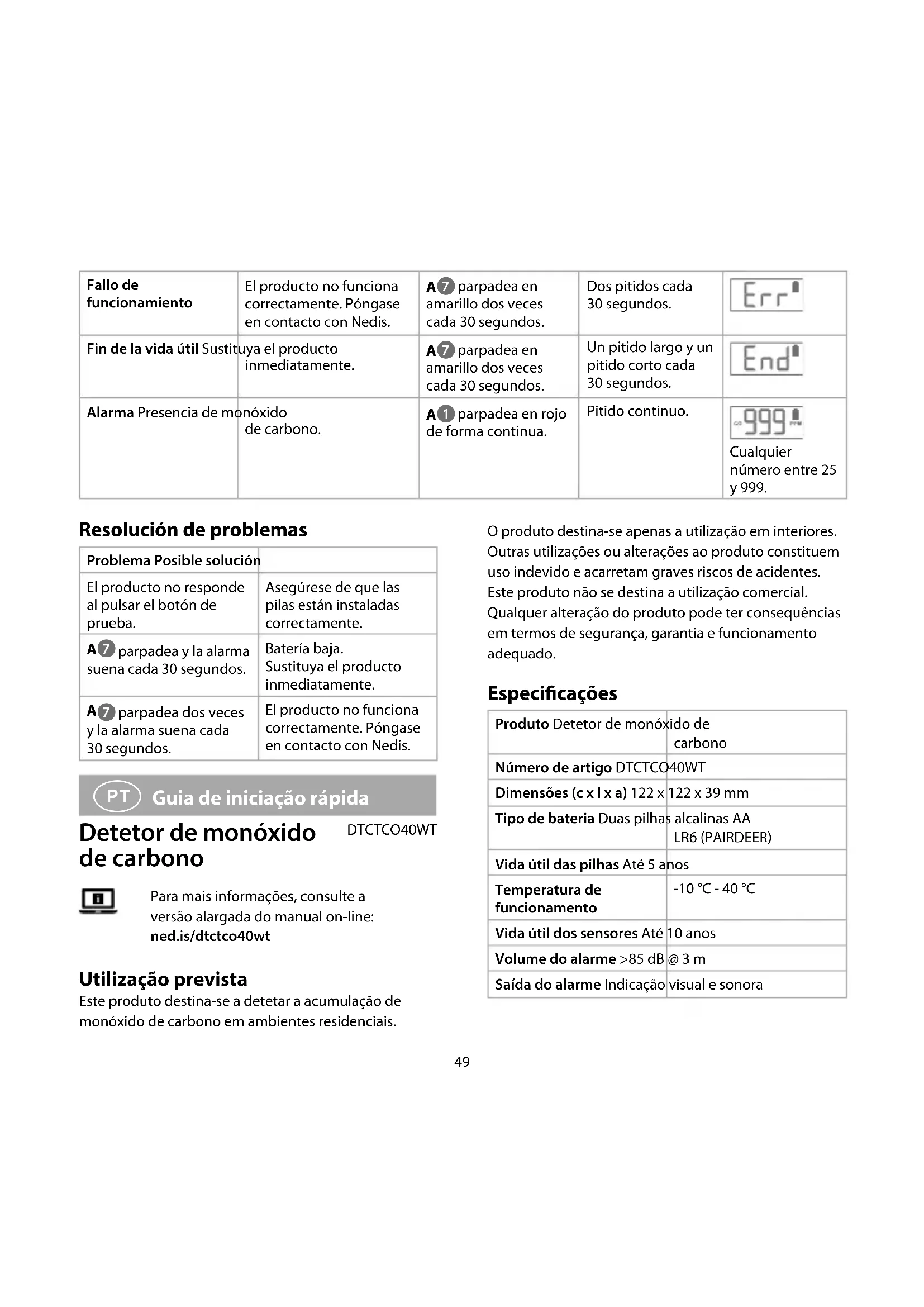 Guia de iniciação rápida Detetor de monóxido de carbono DTCTCO40WT Para mais informações, consulte a versão alargada do manual on-line: ned.is/dtctco40wt Utilização prevista Este produto destina-se a detetar a acumulação de monóxido de carbono em ambientes residenciais. O produto destina-se apenas a utilização em interiores. Outras utilizações ou alterações ao produto constituem uso indevido e acarretam graves riscos de acidentes. Este produto não se destina a utilização comercial. Qualquer alteração do produto pode ter consequências em termos de segurança, garantia e funcionamento adequado. Especicações Produto Detetor de monóxido de carbono Número de artigo DTCTCO40WT Dimensões (c x l x a) 122 x 122 x 39 mm Tipo de bateria Duas pilhas alcalinas AA LR6 (PAIRDEER) Vida útil das pilhas Até 5 anos Temperatura de funcionamento -10 °C - 40 °C Vida útil dos sensores Até 10 anos Volume do alarme >85 dB @ 3 m Saída do alarme Indicação visual e sonora50 Período de aquecimento Aproximadamente 100 segundos Método de instalação Instalação na parede ou no teto Botão «Teste/silenciar» Sim Alerta de pilhas fracas Sim Ppm detetáveis 20 – 999 ppm Humidade de funcionamento 0% – 95% (HR) sem condensação Peças principais (imagem A) 1 Indicador de alarme 2 Indicador de corrente 3 Botão «Teste/silenci- ar» 4 Ecrã 5 Alarme 6 Suporte 7 Indicador de avaria 8 Pilhas (2x) 9 Parafusos (2x) q Buchas (2x) Instruções de segurança