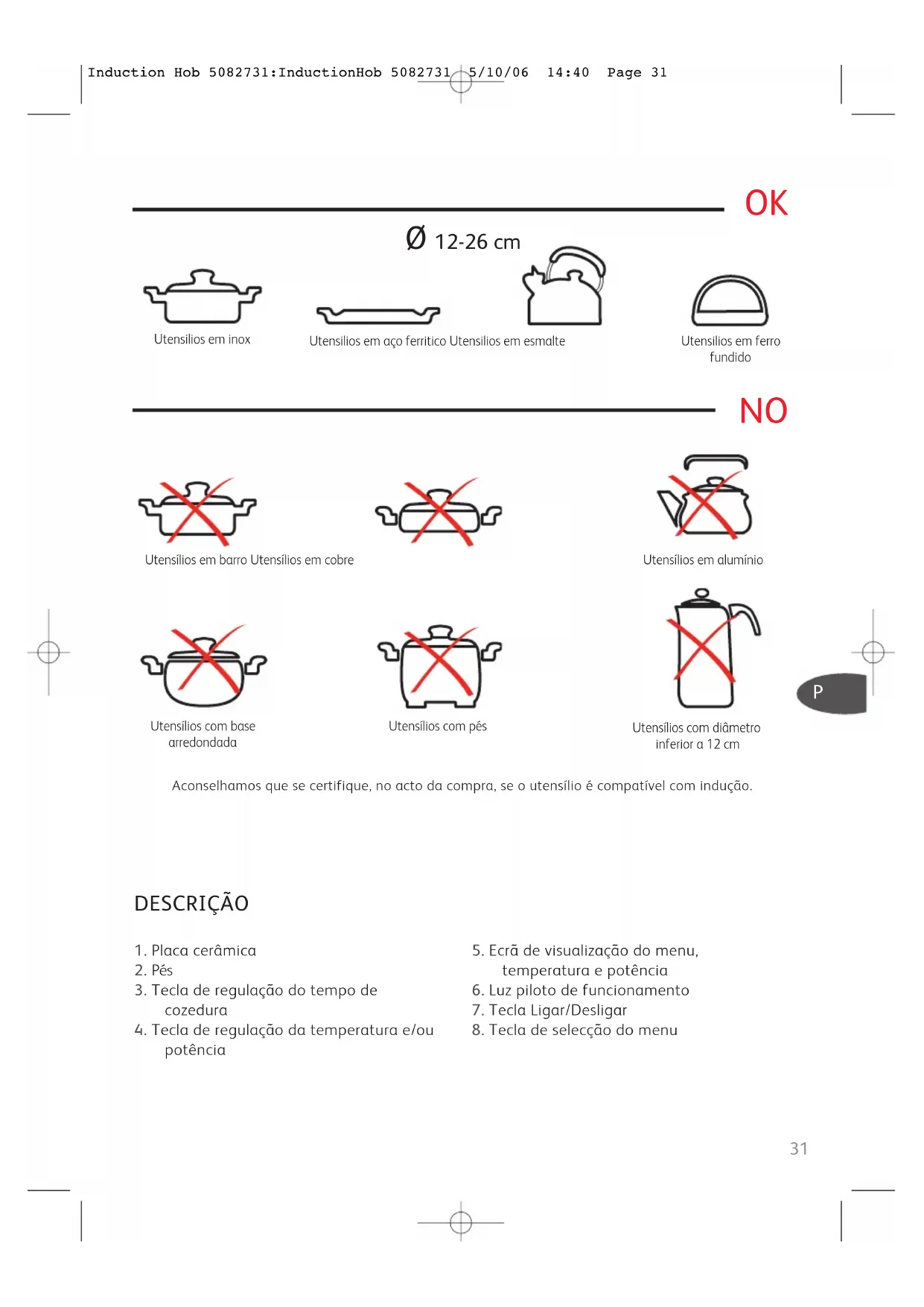 Utensilios em inoxUtensilios em aço ferritico Utensilios em esmalteUtensílios em barro Utensílios em cobreUtensílios com basearredondadaUtensílios com diâmetroinferior a 12 cmUtensílios com pésUtensílios em alumínio Utensilios em ferrofundidoAconselhamos que se certifique, no acto da compra, se o utensílio é compatível com indução. Ø 12-26 cm