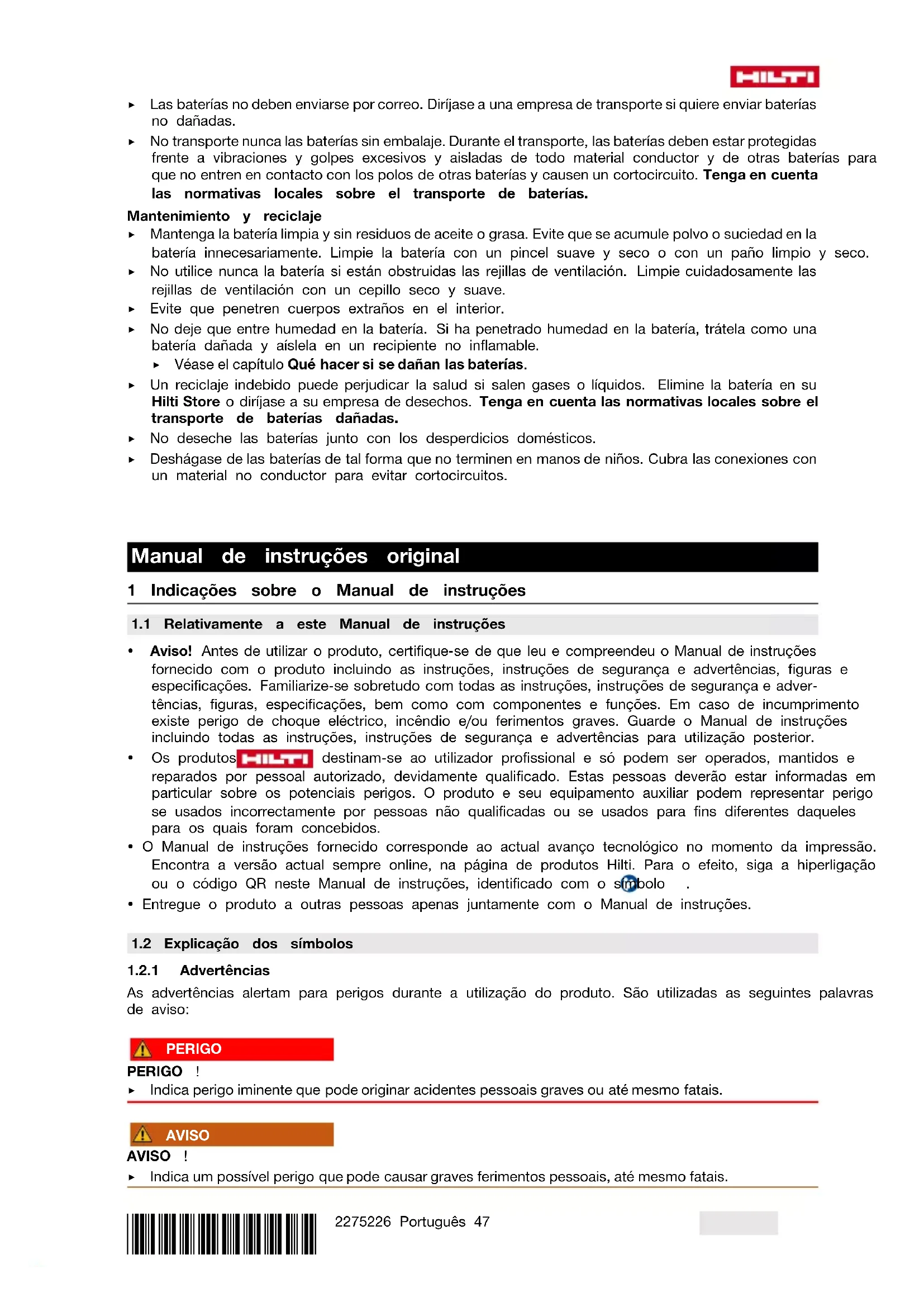 funcionamento indesejado. 11 Garantia do fabricante ▶ Se tiver dúvidas em relação às condições de garantia, contacte o seu parceiro Hilti local. 12 Mais informações 13 Baterias de iões de lítio Hilti Indicações relativas à segurança e utilização Nesta documentação, o termo bateria é utilizado para baterias de iões de lítio recarregáveis, nas quais estão agrupadas várias células de iões de lítio. Foram concebidas para ferramentas eléctricas Hilti e só devem ser utilizadas com estas. Utilize apenas baterias original Hilti! Descrição Baterias Hilti estão equipadas com sistemas de gestão e protecção das células. As baterias são compostas por células que contêm materiais acumuladores de iões de lítio, que permitem uma elevada densidade de energia específica. As células de iões de lítio estão sujeitos a um efeito de memória muito reduzido, no entanto reagem de forma muito sensível a golpes violentos, descarga total ou temperaturas elevadas.*2275226* 2275226 Português 55 Pode encontrar os produtos autorizados para baterias Hilti no seu Hilti Store ou em: www.hilti.group Segurança